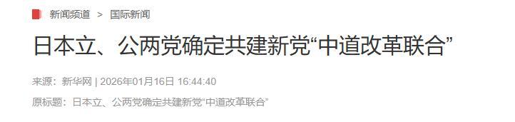 相伴26年的公明党骤然倒戈,与最大在野党立宪民主党联手组建“中道改革联合”,手握166个众议院席位,精准越过155席的否决红线,以一记漂亮的“票仓反杀”,直接封死了高市早苗的所有激进议程。