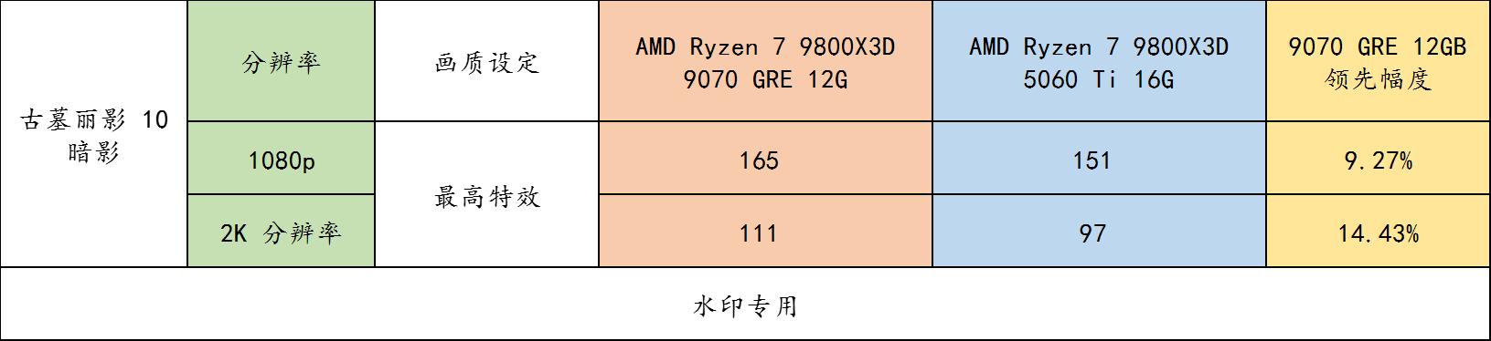 ▲ E 父之前也送过《古墓丽影》三部曲。本次测试采用《古墓丽影 10:暗影》benchmark 进行实测。可以看到 9070 GRE 全方位领先 5060 Ti 16GB,而且在 2K 分辨率下领先幅度扩大。