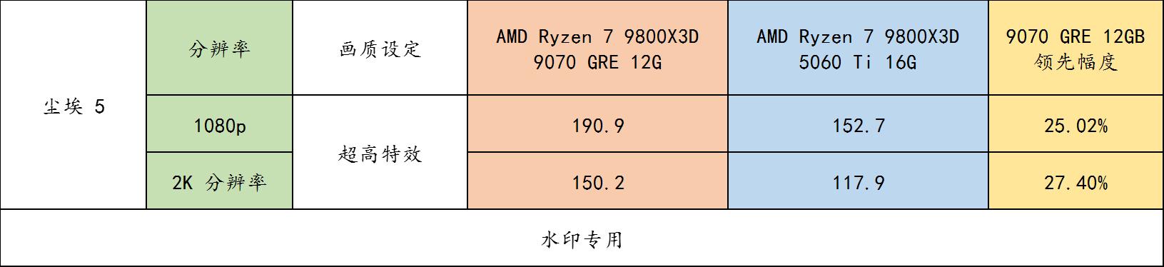 ▲ 《尘埃 5》benchmark 实测。9070 GRE 领先 5060 Ti 16GB 大概 25 ~ 27 % 的游戏流畅度,2K 分辨率的领先幅度会大一点。