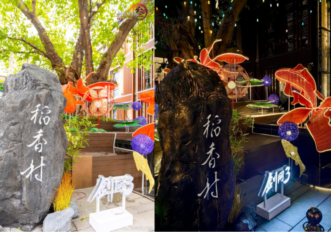 玩家们情怀满满,《剑网3》官方也将这情怀的“启程之处”还原到了永庆坊,在一棵大树下竖起了稻香村的地标,配合荷塘锦鲤的造型花灯,让人一秒梦回那个岁月静好的小村庄,也吸引了众多玩家赶来打卡拍照。