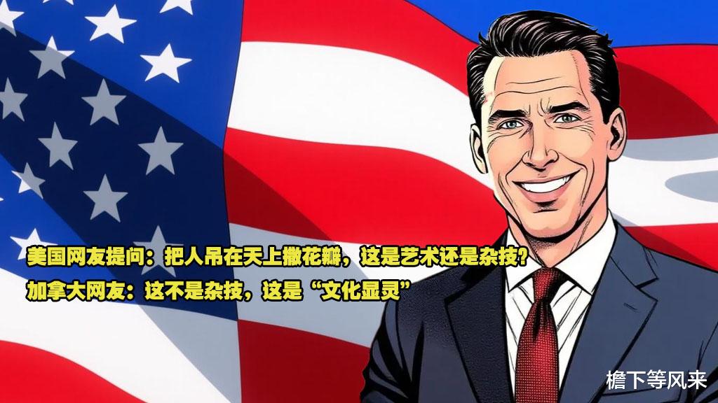 一位美国网友在评论区留言:“这太疯狂了,不就是用钢丝绳把人吊起撒花,这算是艺术表演还是危险杂技?”