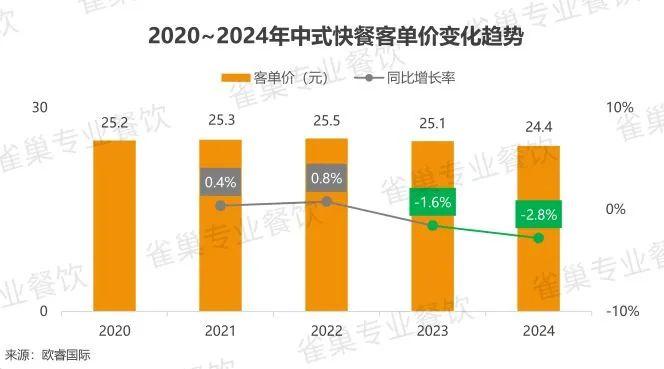 欧睿国际监测数据显示,中式快餐客单价从2020年的25.2元下降到2024年24.4元。“以价换量”策略正侵蚀利润空间,麦当劳2024年营收增长2%,净利润却下滑3%。
