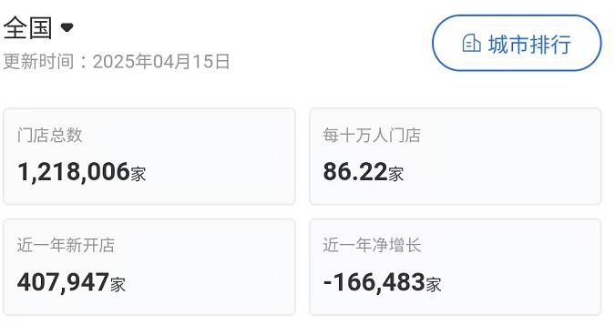 “高增长与高淘汰并存”,窄门餐眼数据显示,截至2025年4月15日,快餐行业门店总数达到121.80万家,近一年新开店40.79万家,闭店数量却高达57.44万家。繁荣表象下,一场关乎存亡的效率革命正在上演。