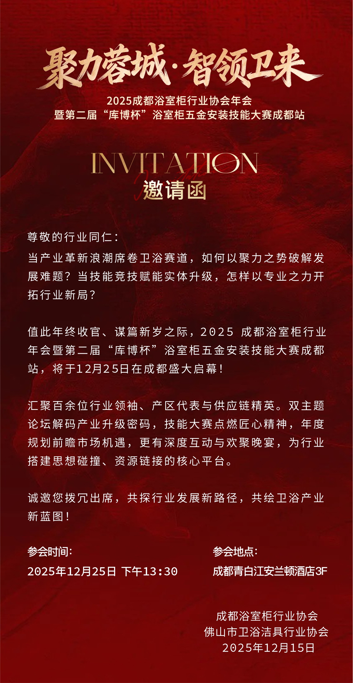 12月25日,第二届「库博杯」浴室柜五金安装技能大赛成都启动会将与2025成都浴室柜行业协会年会同期举行。它将再次点燃浴室柜五金安装技能对决的烽火,引爆全行业对安装技能新一轮关注!