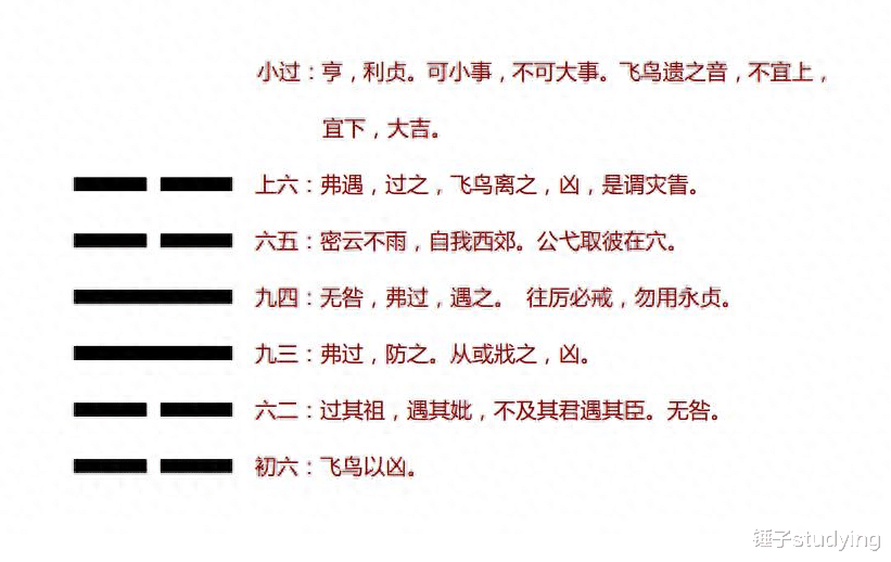 总之,小过卦代表着适度行动和谨慎决策的重要性。它提醒我们在面对事物时,要遵循适度和谨慎的原则,不要过于冲动和急躁。通过小步前进,处理小事情,我们可以积累经验和信心,逐渐应对更大的挑战和事务。