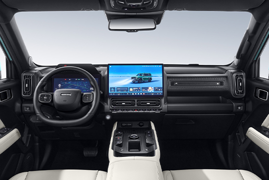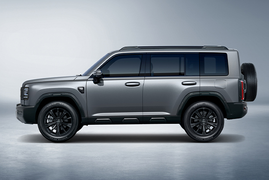 侧面依旧是经典的“方盒子”造型,车身线条笔直、硬朗,再搭配黑色轮眉以及大尺寸熏黑轮毂,越野氛围营造得十分出色。车身尺寸方面,新车长宽高分别为4800mm*1950mm*1843mm,轴距为2738mm。