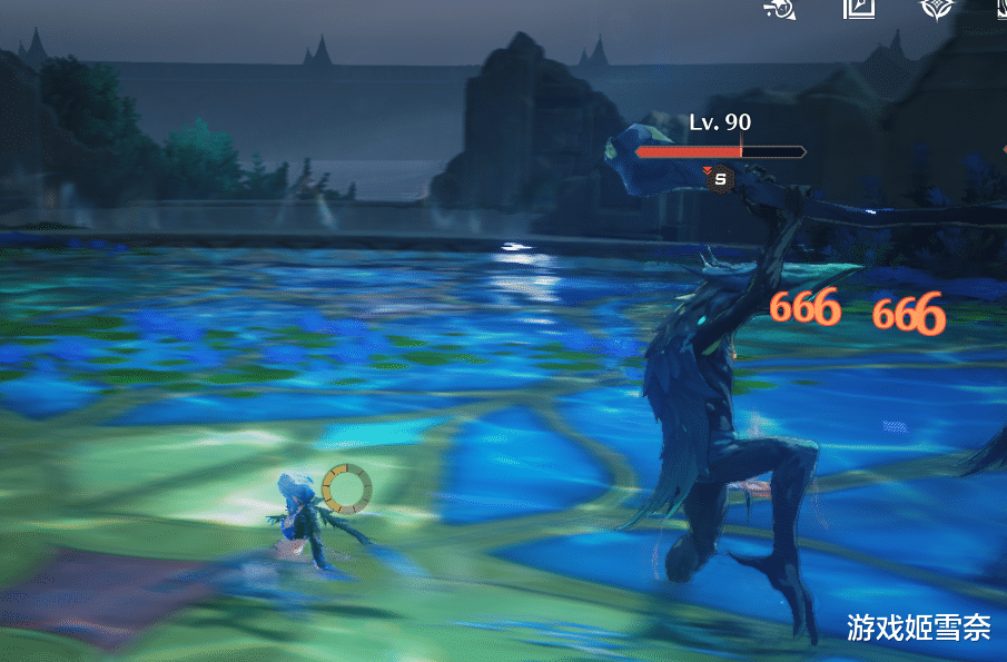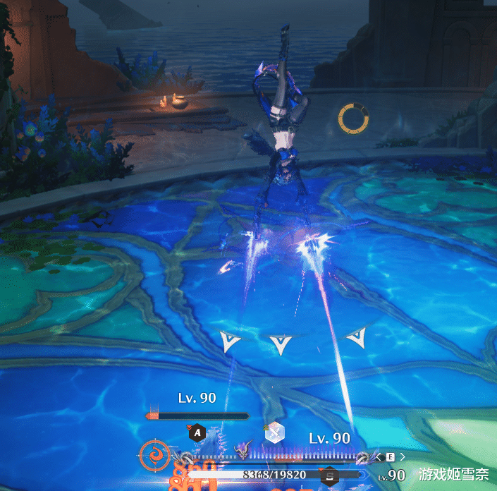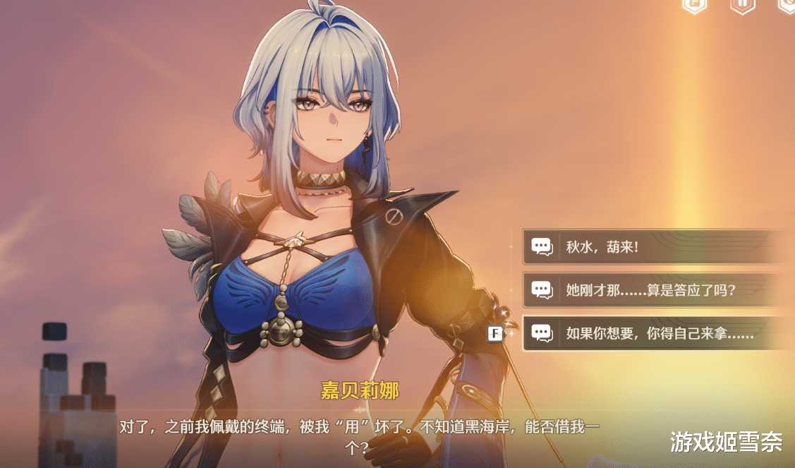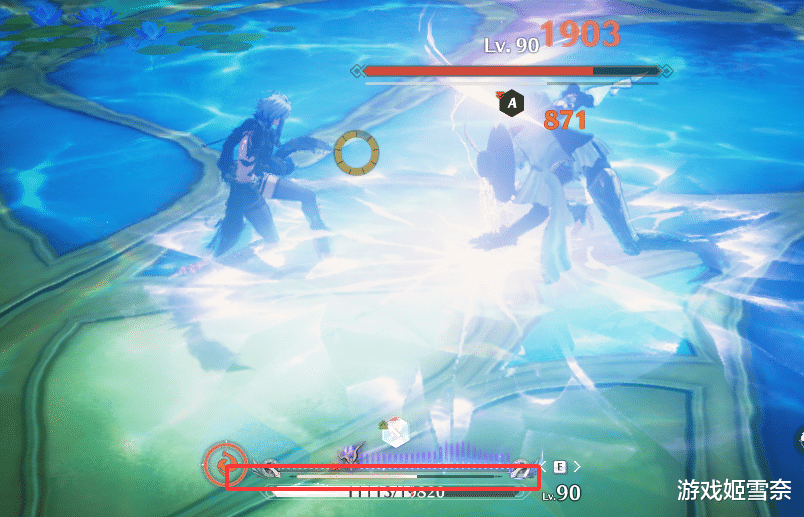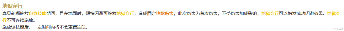 还有一个独立的白条在能量条与血条之间,存在时能够为嘉贝莉娜提供20%的攻击力提升与抗打断效果,只要记得在白条快消失的时候进行闪避+攻击,就能触发嘉贝莉娜独特的闪避机制,滑铲穿过敌人并造成固定666点伤害,重置白条时间无限续杯增伤,触发白条BUFF的方式还有变奏入场,普攻第四段和共鸣技能,而滑铲普攻是最稳定最迅速的续杯方式。