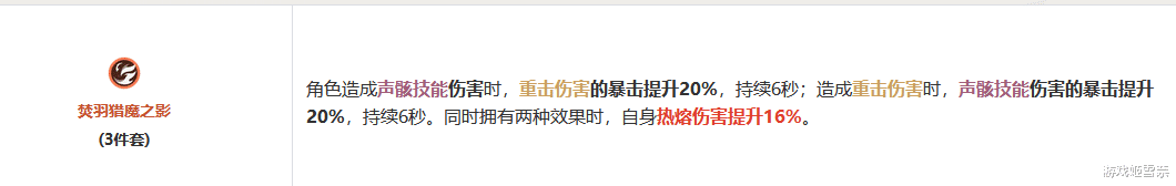 库洛你真是一个角色一个声骸啊,3件套选择为嘉贝莉娜新出的专属和鸣焚羽猎魔之影,跟武器触发类似,造成声骸声骸提升重击,造成重击伤害提升声骸,不过提升的是暴击率,两种都有提升热熔伤害,剩下的两件套可以在已有的热熔里面挑好的拿,效果都是一样的提升10%热熔伤害。