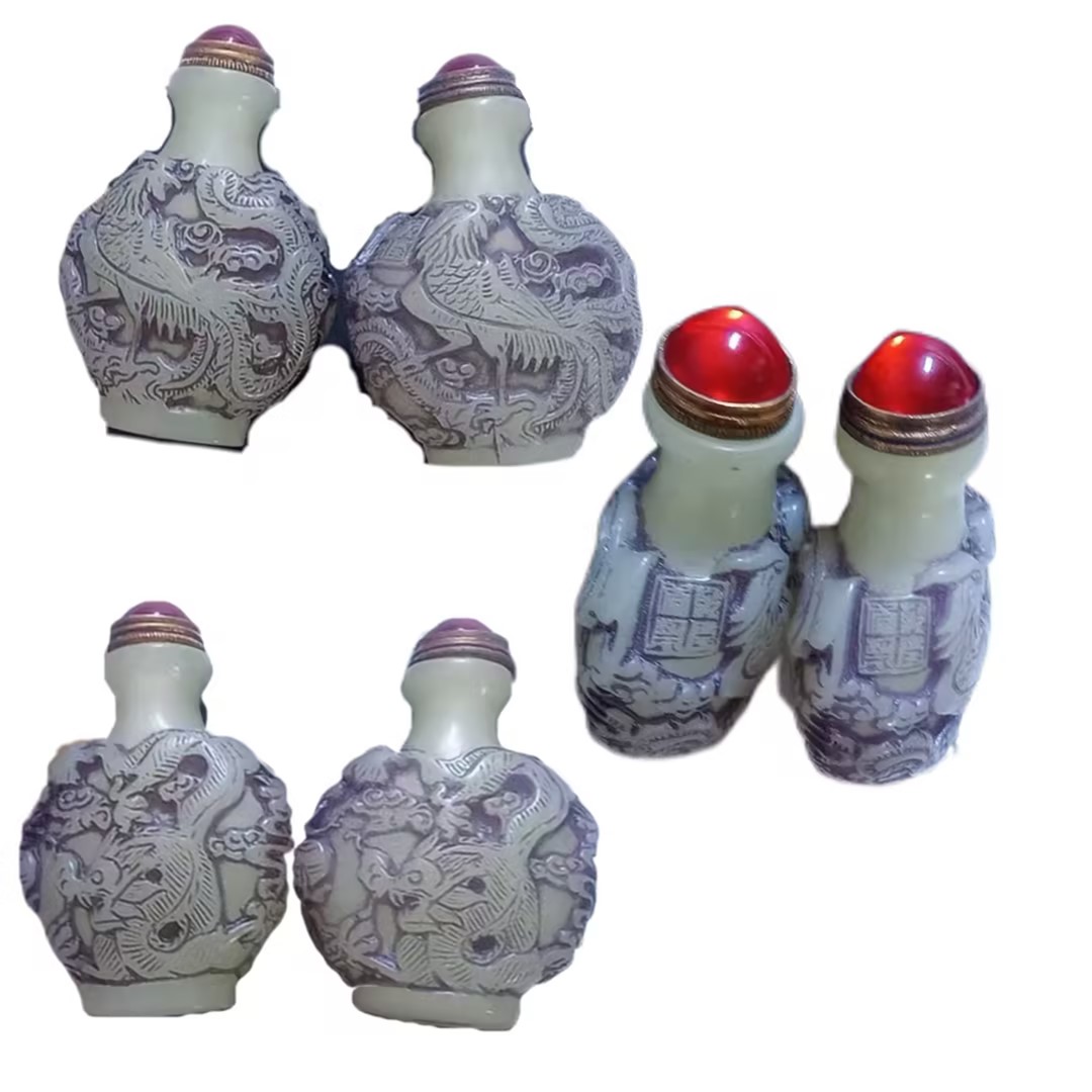 当代(1978年至今):收藏市场的“文化资产”:随着传统文玩收藏的兴起,这对鼻烟壶的价值完成“质的飞跃”——1995年,类似藏品在香港拍卖会上以“15万港元”成交;2023年,某拍卖会上一套同等级别的玉雕龙凤纹鼻烟壶,成交价达“280万元人民币”,30年间涨幅超18倍,其价值已从“古董”升级为“文化资产”。
