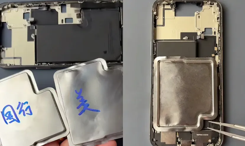另外iPhone17系列多了一个屏幕的底版,也就是双底板设计,这个多出的底板比较恶心就是,美版上面多出了14颗螺丝,其中里面还有一颗是新规格,Pro系列的散热贴纸也是非常多,非常脆弱,改卡非常考验手工,今年iPhone17系列的改卡不便宜。