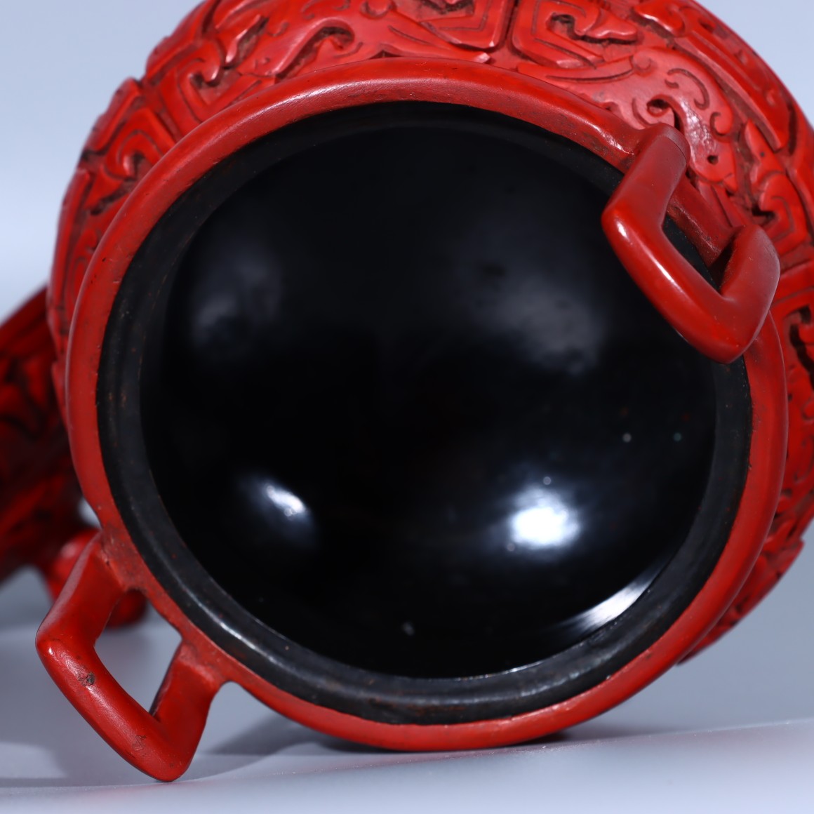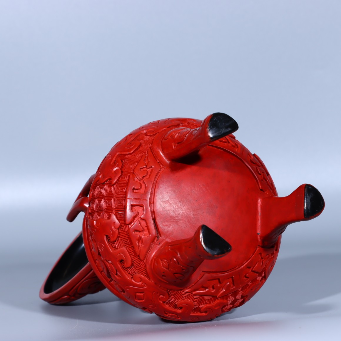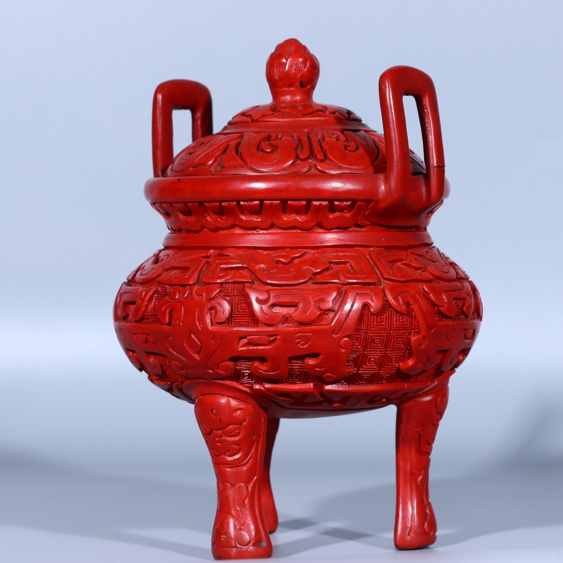 旧藏 剔红雕花冲天耳盖炉。 规格:高16cm 腹径10.5cm 重405.5g 冲天耳,三足,满工精雕,匠心之作,造型精