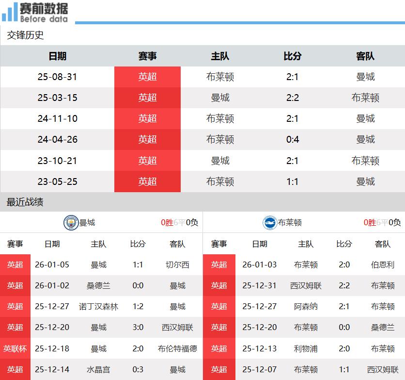第一:两队情况!英超20轮战罢,曼城13胜3平4负积42分排名第二,落后榜首阿森纳多达6分;布莱顿7胜7平6负积28分排名第十,落后欧冠区仅3分。上轮英超,曼城主场1-1遭切尔西绝平,近2轮全部战平;布莱顿主场2-0力克伯恩利,终结了联赛6轮不胜。