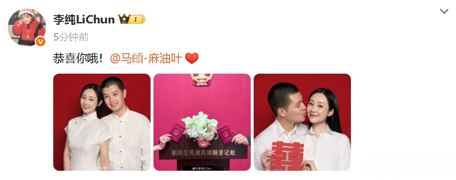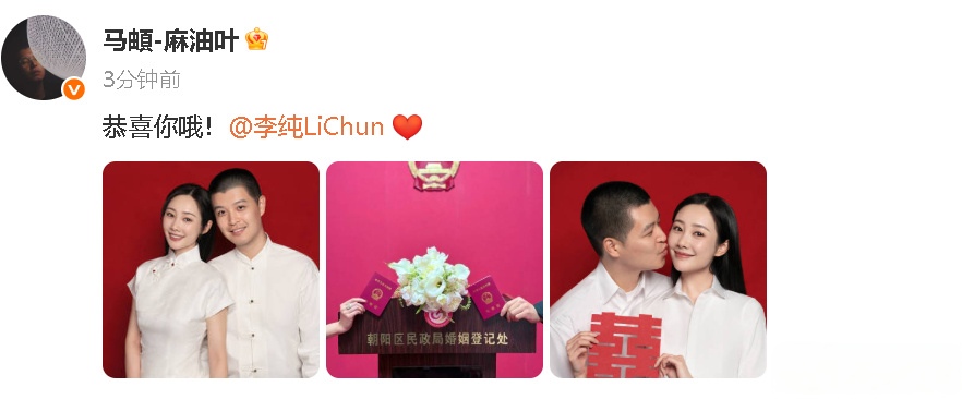 今天(10月2日)上午,娱乐圈迎来一场备受瞩目的喜事——演员李纯与民谣歌手马頔正式官宣结婚!两人在社交平台晒出结婚证及领证现场照片,互相甜蜜喊话“恭喜你哦!”,简洁的文案中洋溢着满满的幸福。照片中,这对新人身穿简约白色衬衫,手持结婚证笑容灿烂,李纯还穿着旗袍套装,化了淡妆,手举囍字,脸上洋溢着甜蜜的笑容,而马頔则嘟嘴亲吻老婆,憨萌模样引得网友纷纷点赞祝福。