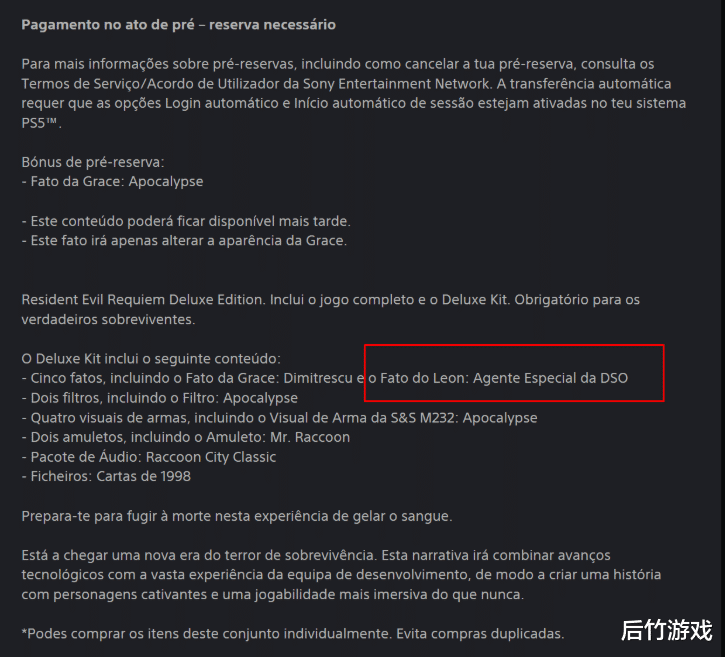 该贴提到,在10月29日葡区PS商城开启预购时,有人在游戏的豪华版看到如此描述:“五套服装,包括格蕾丝服装:迪米特雷斯库夫人套装;里昂服装:DSO特工套装。”