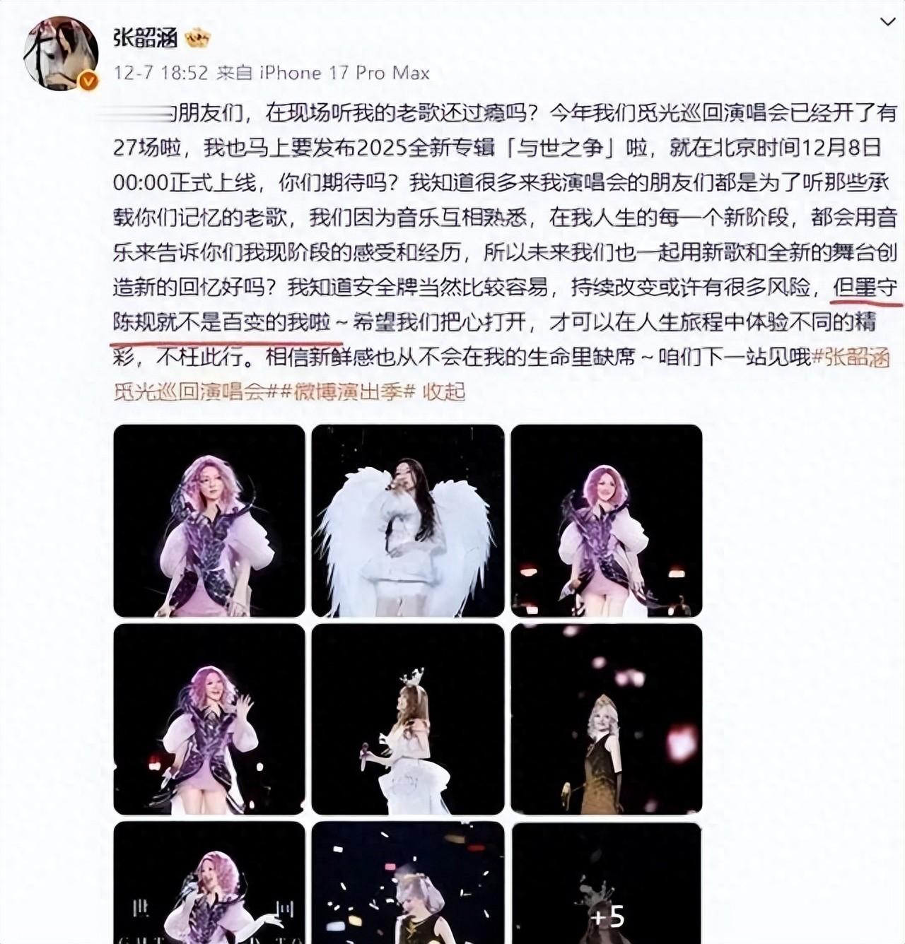 张韶涵本人在事件后也通过社交平台作出回应。她于演唱会后不久发布文字,指出坚持不变规就无法体现百变风格。她鼓励大家敞开心扉,接受不同尝试带来的新鲜感,并表示这种探索在她的职业生涯中从未缺席。这一回应体现了她对造型多变性的坚持,旨在引导讨论从负面转向对创新的认可。