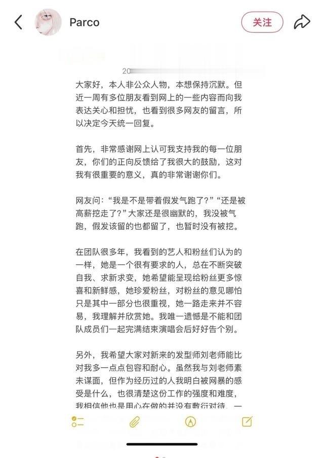 在事件发酵后,前发型师Parco于2025年12月13日通过社交平台发布长文,回应相关议论。他首先澄清离职原因,与网暴或高薪跳槽无关,而是属于工作安排的常规变动。Parco表示,唯一遗憾在于未能与原有团队成员共同完成巡演的收尾工作,无法在演唱会结束后进行正式告别。这一回应旨在消除外界对离职动机的误解,同时强调团队协作的职业性。