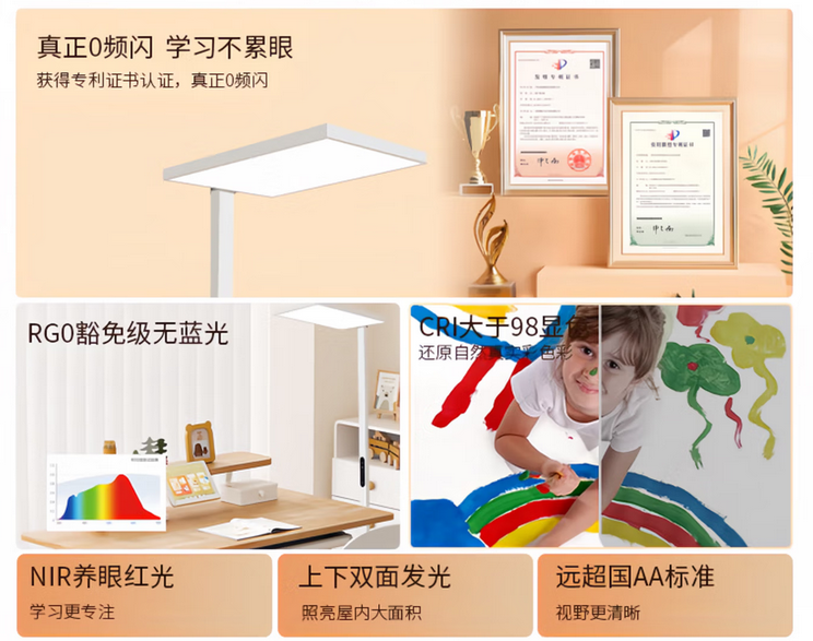 这款灯的各项参数均达到高端护眼灯标杆水平,远超国家标准。比如桌面平均照度1415lx,全屋平均照度>500lx,覆盖大空间无压力;显色指数Ra>97,色彩还原鲜活逼真,蓝光等级RG0、无可视频闪,且UGR<9,极 致柔和不刺 眼。
