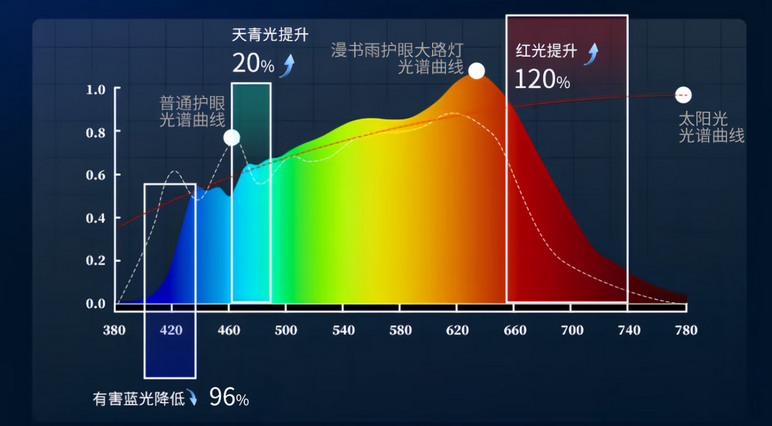 很多产品在宣传时总是爱强调“无蓝光”,甚至客服也会强调一点蓝光都没有。其实这种宣传话术就已经违反了基本的光学规律。要知道全光谱中,蓝光是必不可少的,如果光谱中真的一点蓝光都没有反而会造成光线显色性差,增加眼部负担。