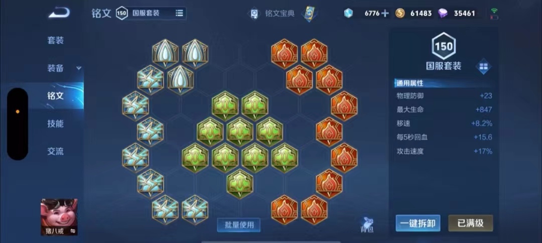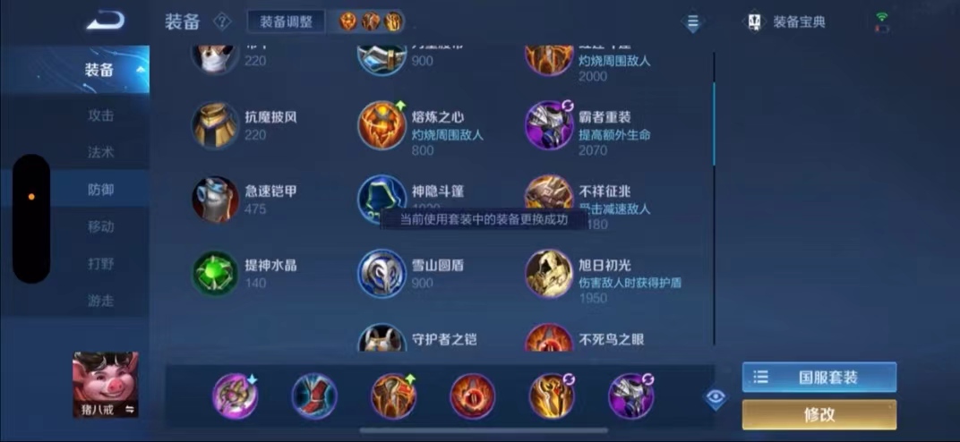 出装铭文也随着上次的削弱有所改动:首先出肉刀,冷却靴,之后直接红莲,这样提高我们的刷野效率,然后做一个小黄盾,弥补猪八戒前期的弱势,因为黄盾有一个回血效果,这对他的续航有很大的帮助,之后不死鸟,到这里猪八戒的装备就差不多成型了,可以去尝试找对面打架或者进对面野区,然后补大野刀,大黄盾,最后一件出霸者。