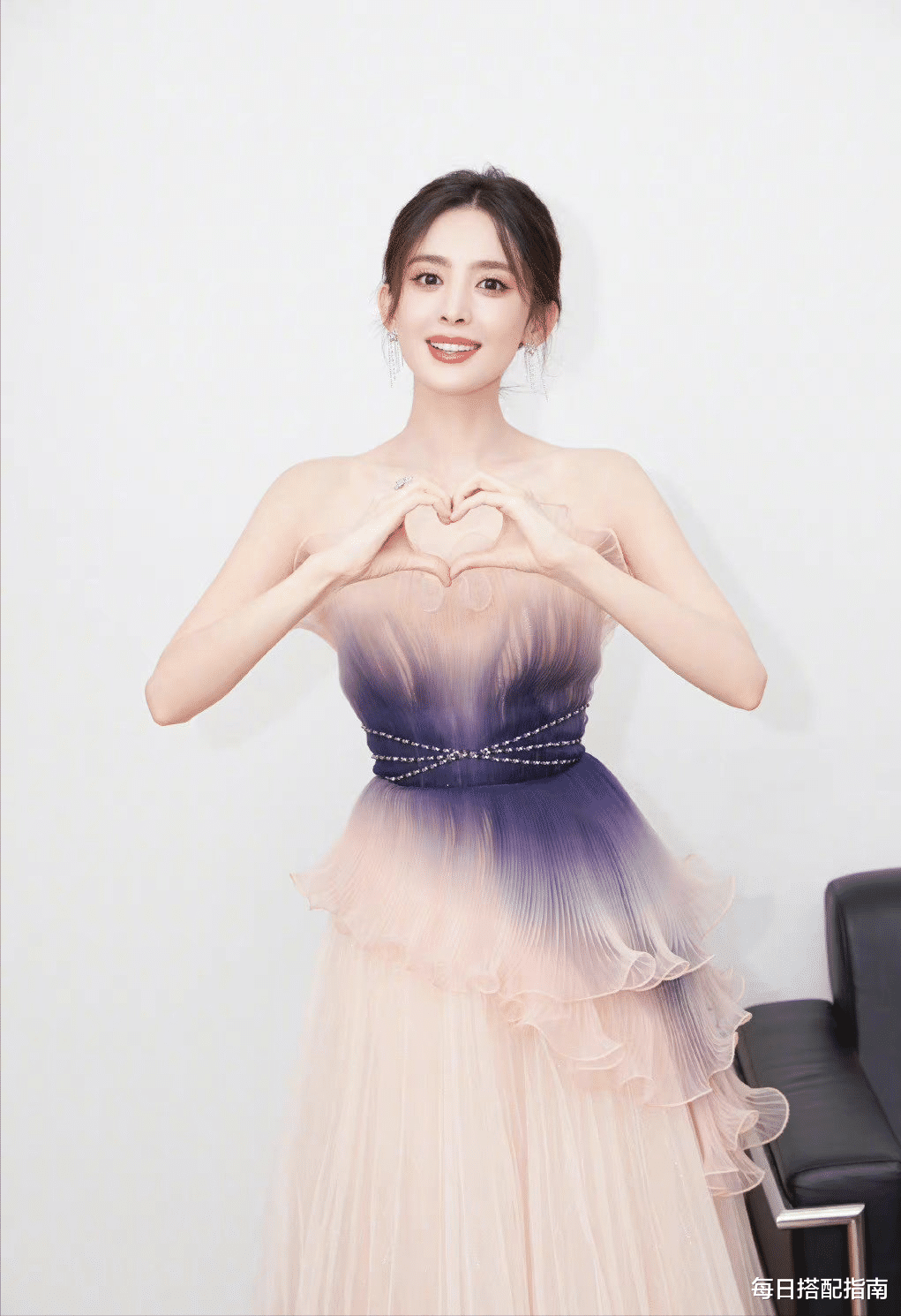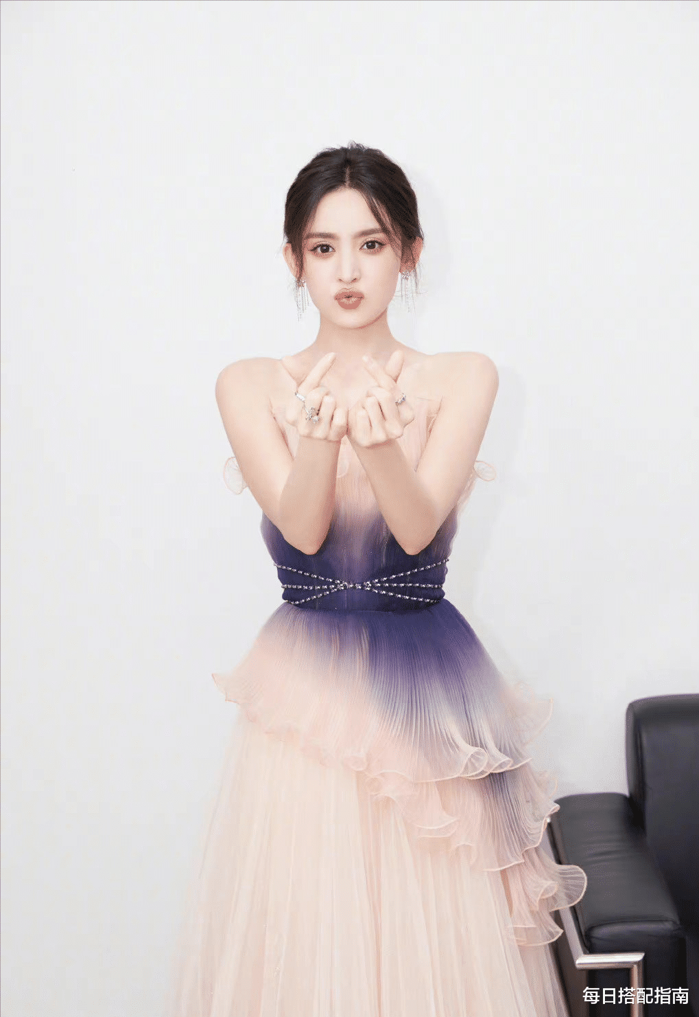 娜扎礼服的粉紫渐变给人一种从梦幻到神秘的过渡感,这其实是非常聪明的设计。对于普通人来说,不一定要选择奢华的礼服,但在日常单品里可以运用渐变色、拼色、同色系深浅搭配。