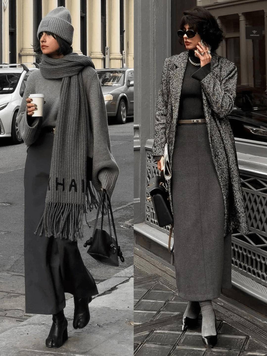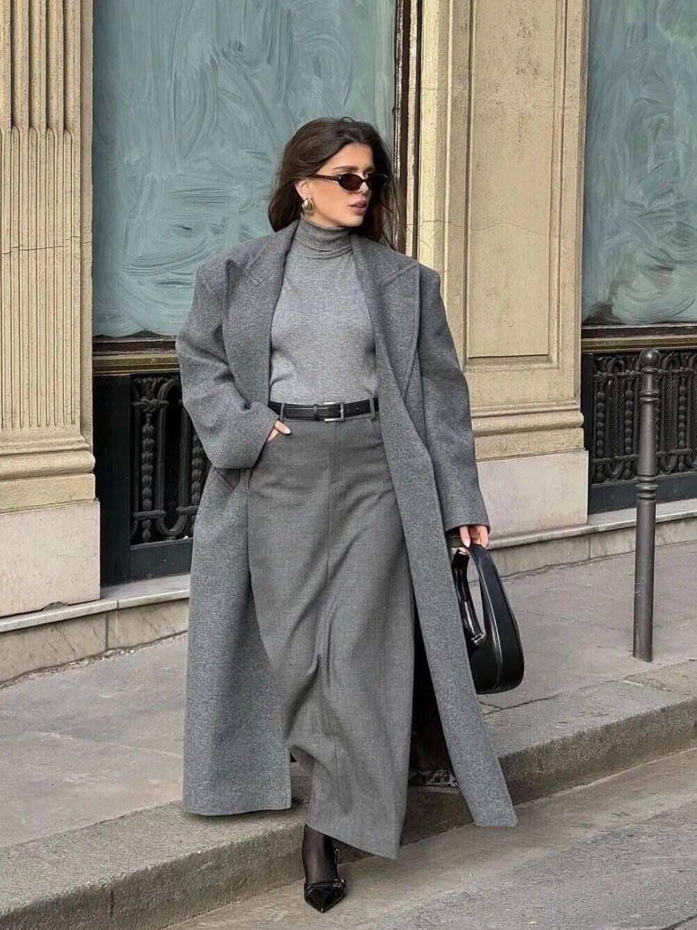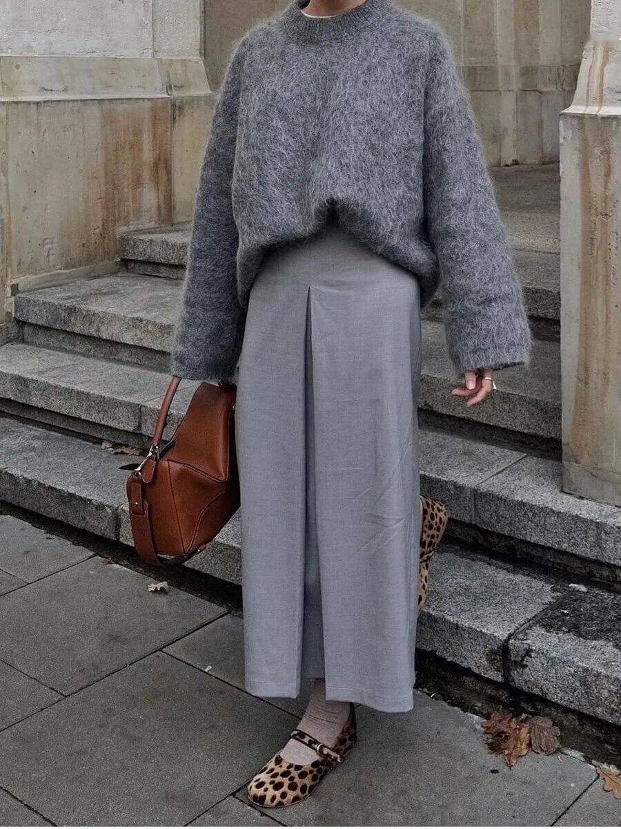 同色系搭配是展现高级感的绝佳方式。灰色是演绎同色系穿搭的绝佳载体,一条灰色半裙可以与不同深浅的灰色上衣相呼应——从烟雾灰的毛呢外套到炭灰色的针织开衫。