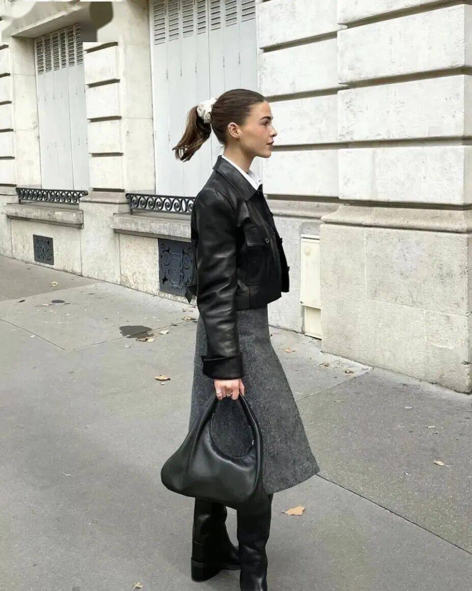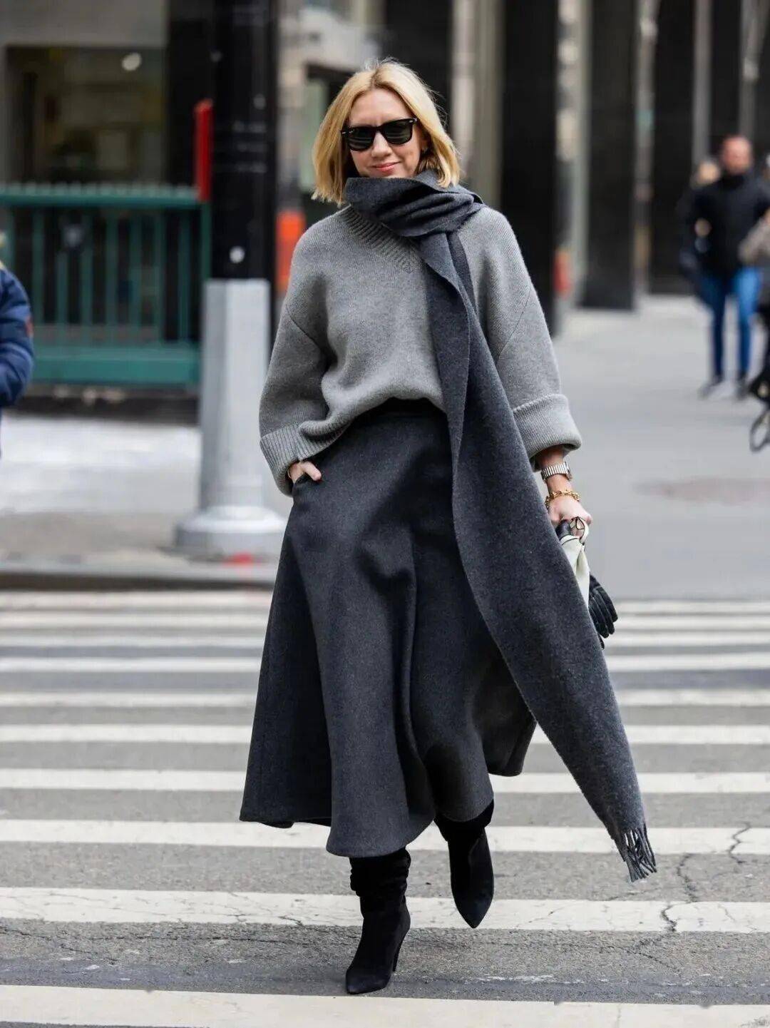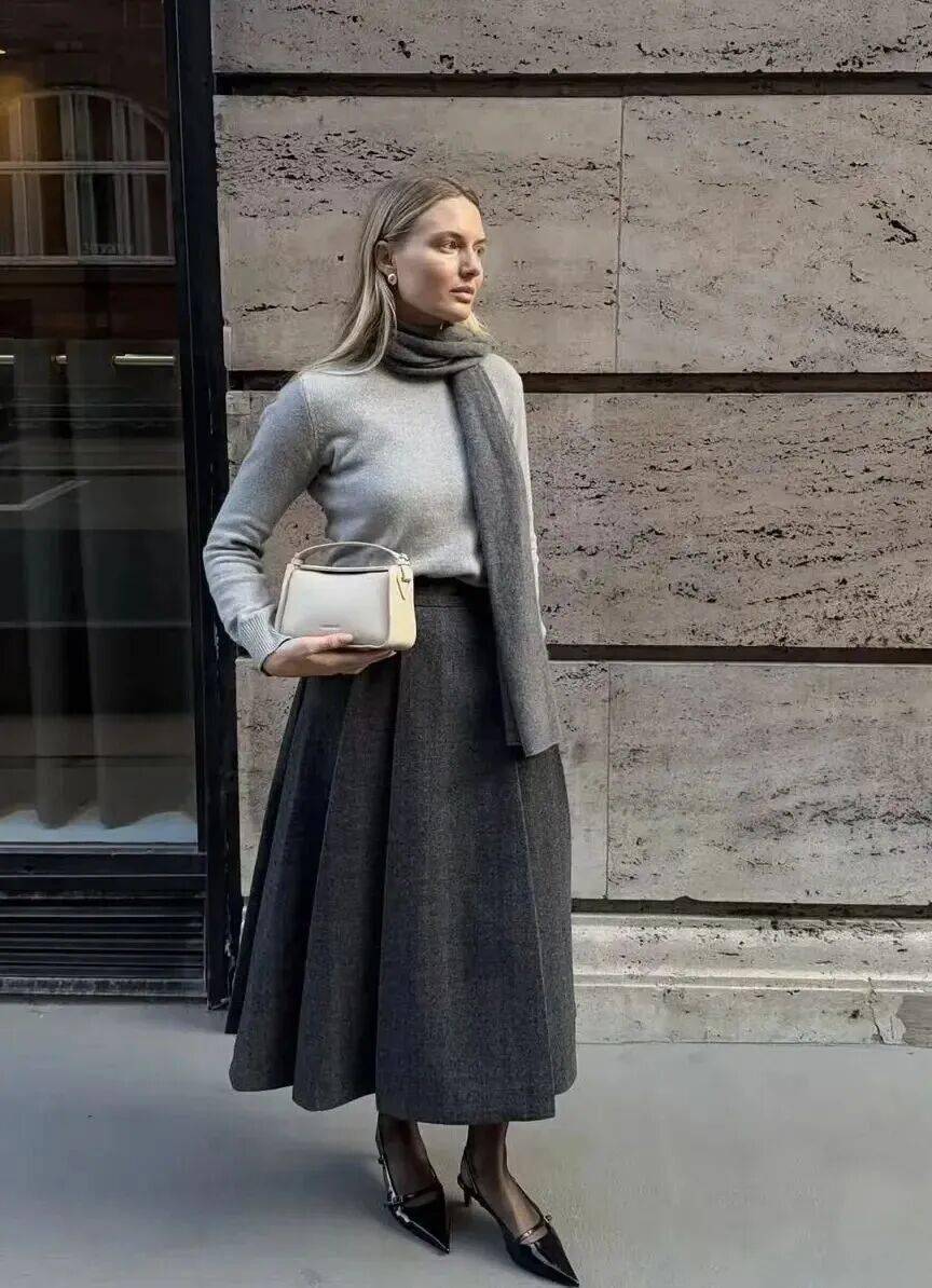 羊绒衫+羊毛半裙的搭配,可以通过材质对比营造出“近看才知究竟”的奢华。同样是灰色,羊绒的糯软光泽与羊毛的哑光质朴形成微妙对比,这在灰色的统一色调下激烈碰撞,结构感极强。