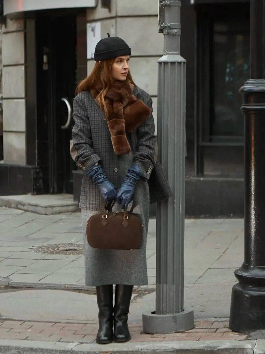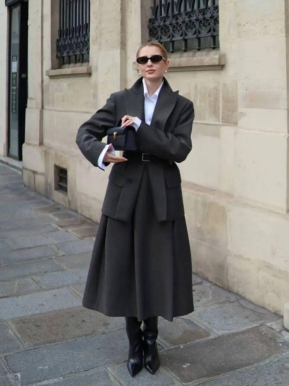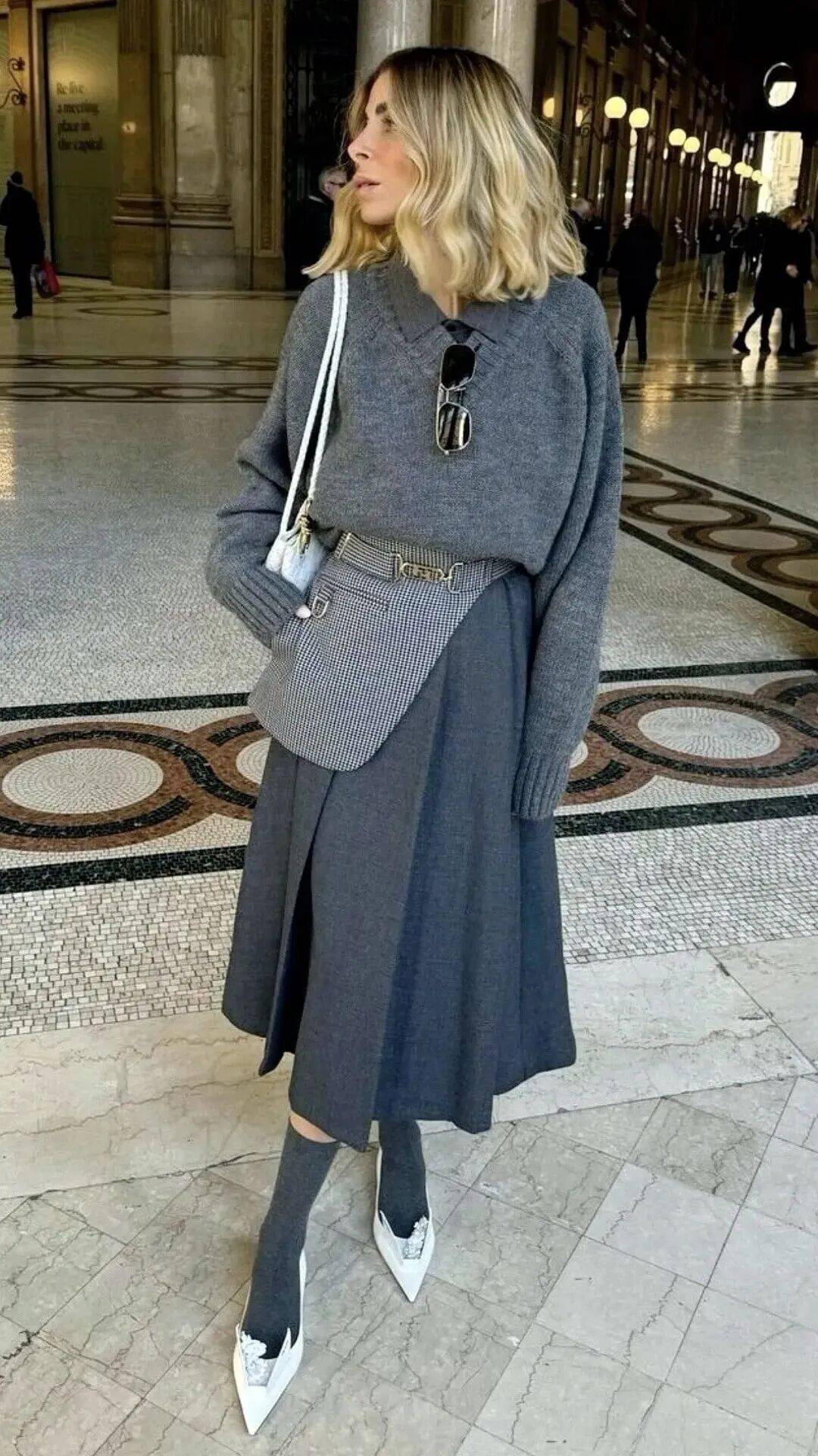羊绒衫+羊毛半裙的搭配,可以通过材质对比营造出“近看才知究竟”的奢华。同样是灰色,羊绒的糯软光泽与羊毛的哑光质朴形成微妙对比,这在灰色的统一色调下激烈碰撞,结构感极强。