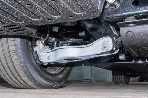 底盘是岚图FREE+的又一亮点,官方称之为“百万底盘”。前双叉臂、后多连杆独立悬挂,并且配备了可调软硬高低的空气悬挂以及CDC连续阻尼减振系统(魔毯悬挂)。这套组合让车辆在不同路况下都能保持良好的行驶品质。在城市道路,将悬挂调至舒适模式,底盘能够有效过滤路面细碎颠簸,过减速带时车身起伏柔和,车内乘客感觉不到生硬的冲击;切换到运动模式,悬挂变硬,侧向支撑加强,配合精准的转向(转向力度三挡可调),在山路或快速过弯时车身姿态稳健,给予驾驶者充足的信心。此外,空气悬挂还能调节车身高度,在高速时自动降低以提升稳定性,在烂路时升高以增加通过性,实用性很强。