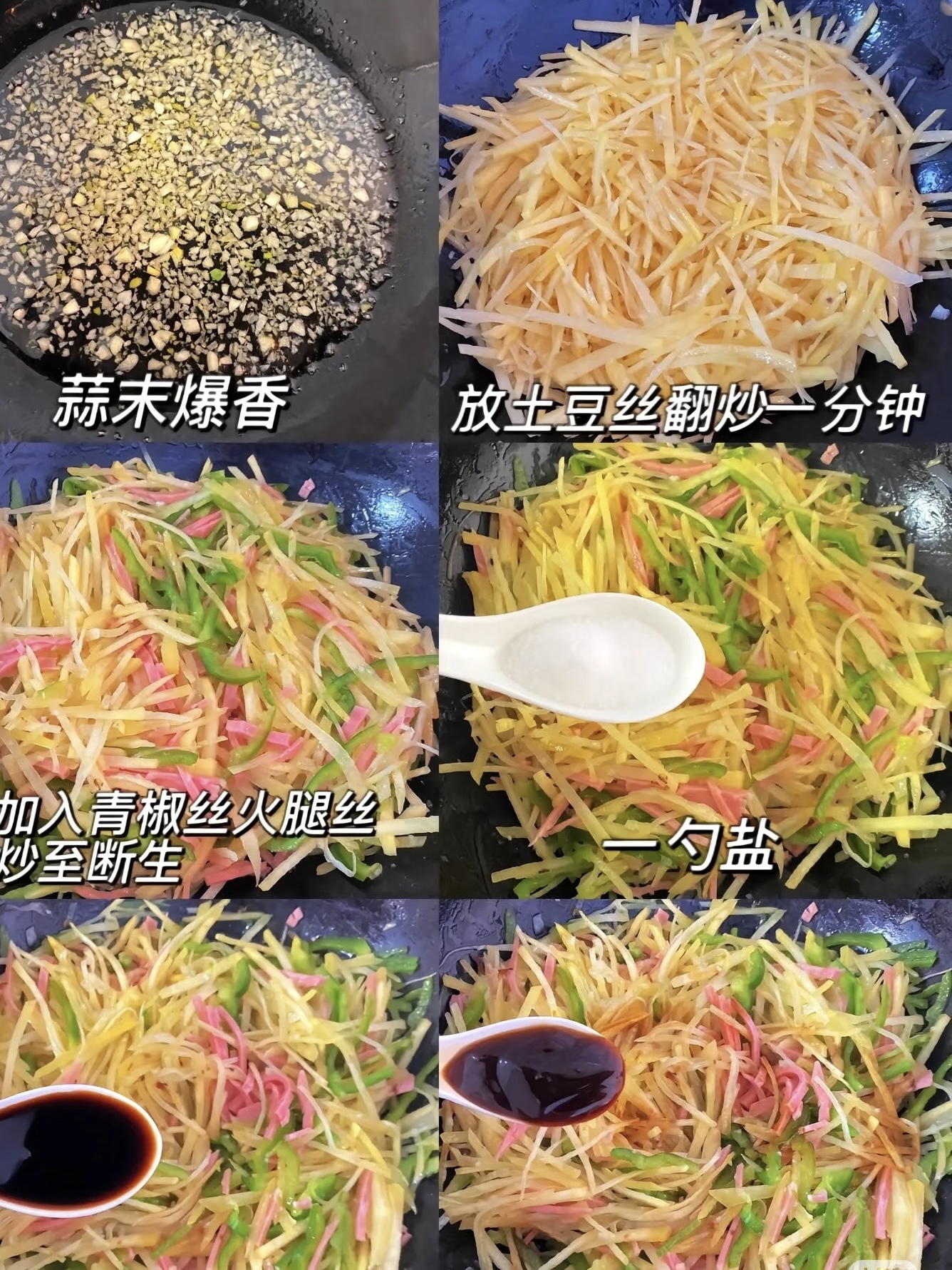 锅里刷薄油,蒜末下去“滋啦”一声,香味比闹钟管用。土豆丝集体跳水,大火翻炒60秒,看颜色从乳白变透亮,说明快熟了。加入青椒丝和火腿条,继续蹦迪30秒,撒一点点盐,别多,后面还要蘸酱。炒至“断生”立刻出锅,保持脆感是关键,软趴趴的土豆丝没有灵魂,记住口诀:锅要热、手要快、时间要抠秒表。