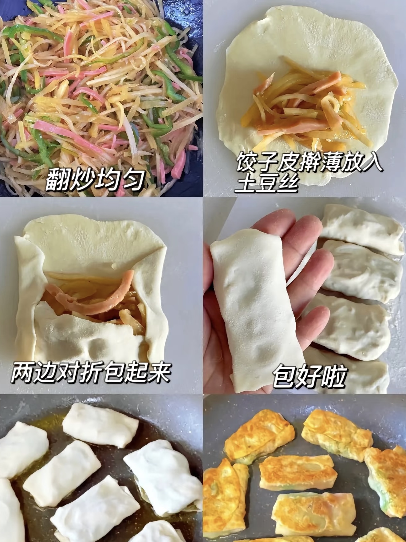 饺子皮登场!买现成最薄的,案板撒面粉防粘,单张擀成原来1.5倍大,薄到透光却不破,是“好卷”的灵魂。把炒好的土豆丝横铺在皮中间,别贪多,否则卷成“孕妇”易爆裂。左右对折,再上下卷成春卷样,接缝处抹点水,瞬间“502”粘合。收口朝下码好,颜值像小号墨西哥卷,拍照先发朋友圈,评论区提前流口水。