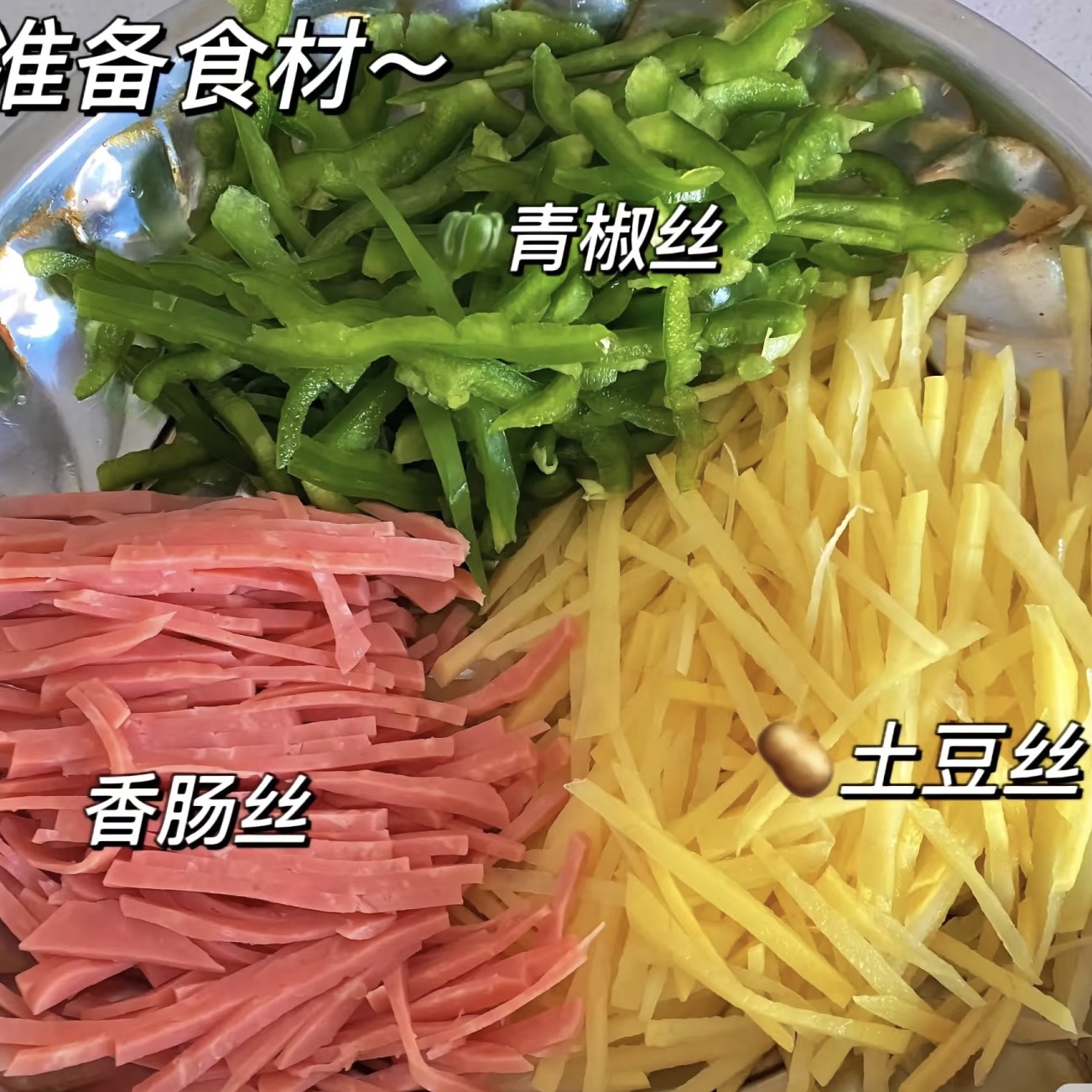 先给土豆丝“办身份证”。土豆选黄心脆口型,去皮切细丝,考验刀工?不!刨丝器30秒解决,丝越细越易熟,口感越脆。冲三遍冷水,把表面淀粉冲掉,防止炒成“土豆泥”,沥干备用。青椒去籽切同粗细的丝,色彩搭配立刻从食堂升级网红店;火腿或香肠切条,肉味担当,素食党可换成鸡蛋丝,一样香。蒜两瓣剁末,爆香用,不吃蒜的请把这篇关掉(开玩笑,可以省略但香味打折)。