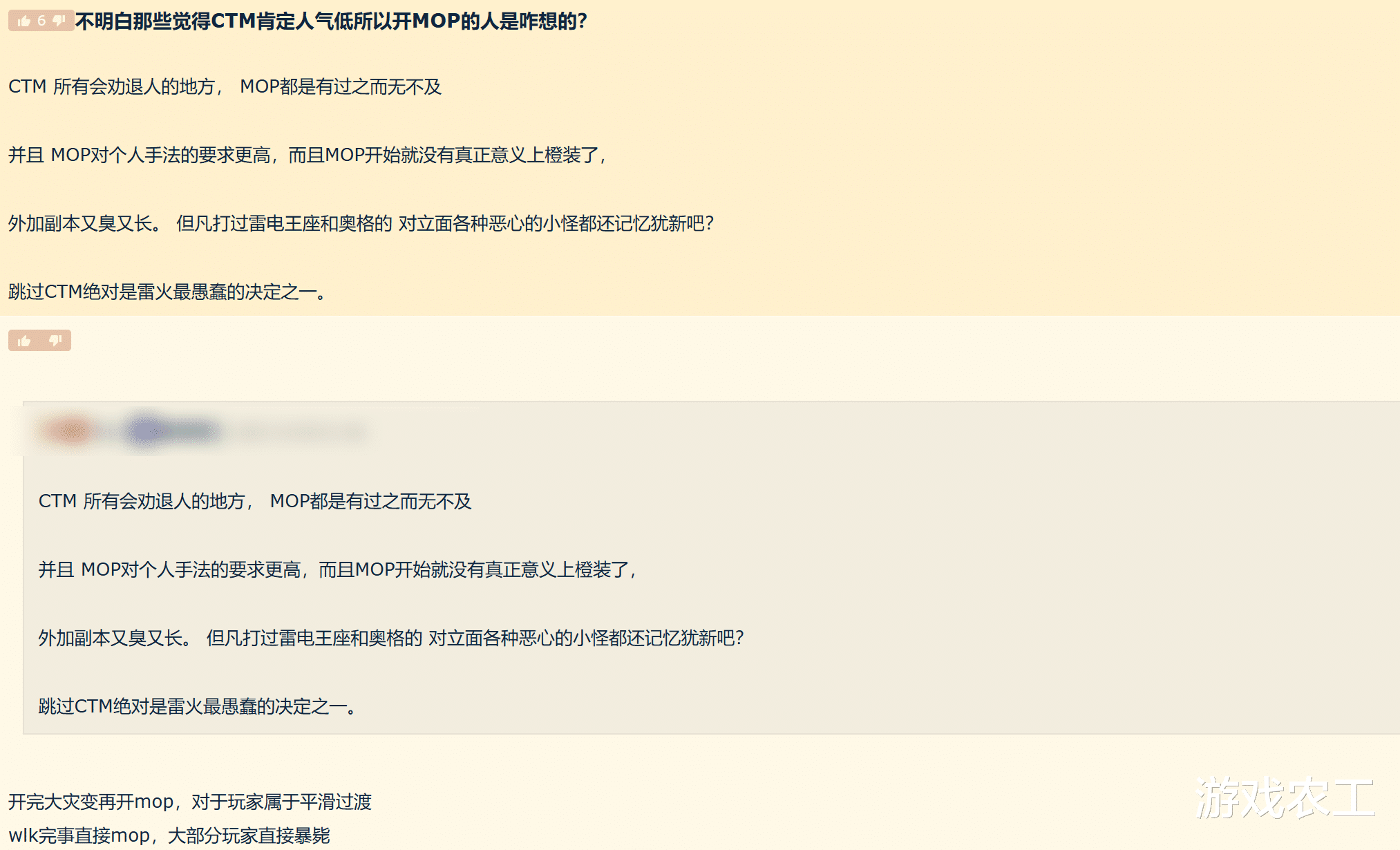 根据帖主的说法,CTM有劝退玩家的地方,而MOP更会劝退玩家,尤其是MOP对玩家的手法要求更高,并且MOP没有真正意义上的橙装。其次,MOP的副本很长,玩过正式服的玩家都知道,目前正式服的副本会劝退很多人,尤其是开荒阶段,很多顶级公会都要花很长时间才能拿下,更何况普通玩家。