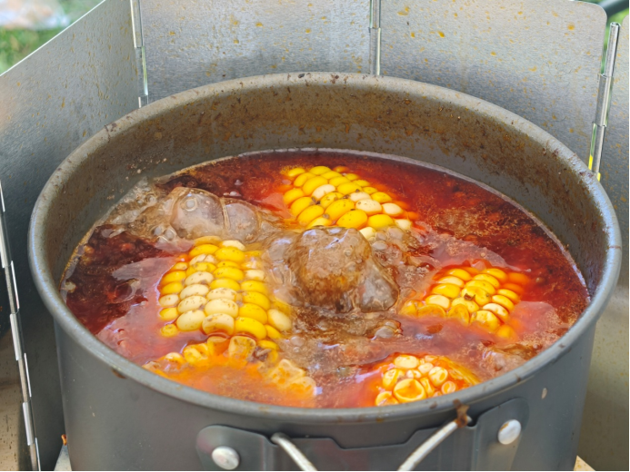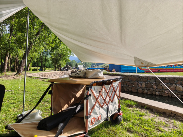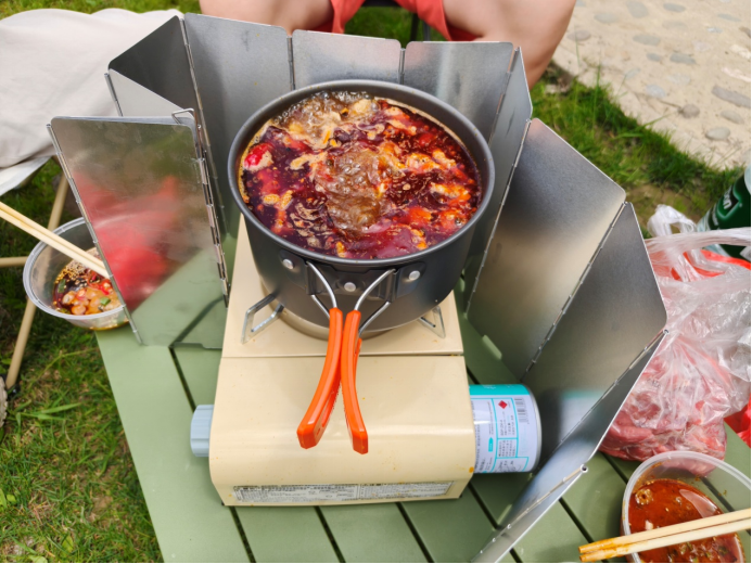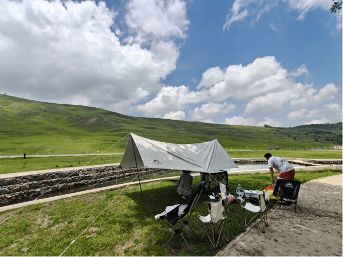 搭建天幕,组装露营装备,这都是提前准备好的,蛋卷桌子,折叠椅子,还有卡式炉,我们提前准备的排骨玉米火锅,马上就安排起来了