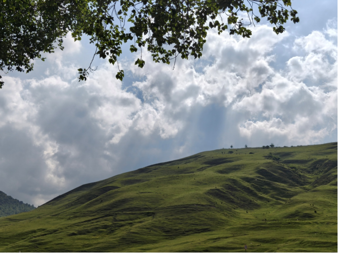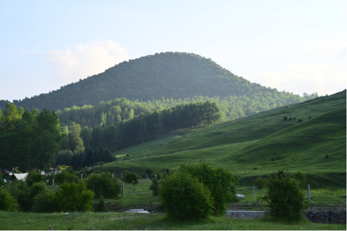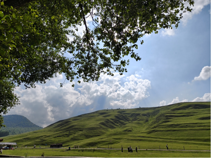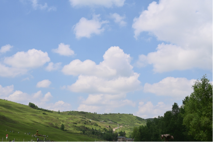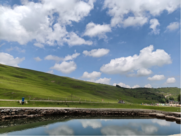 天上的云就像一片一片的超大棉花糖,远处的山坡就像一块一块的奶油蛋糕,再加上这一汪泉水,恰似一块碧玉,镶嵌在天与山之间