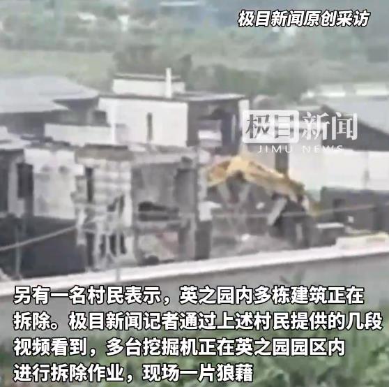 如今,在5月27日晚上,有十多台挖掘机一起工作,开始拆除了这个违建豪宅,但是因为“英之园”周围被围住了,并不能看到“英之园”里的具体情况。