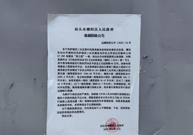 由于陈英彪没有拆除,2025年5月9日,汕头市潮阳区人民政府直接发了强制拆除公告,给陈英彪下了最后通牒,45 天内必须自己动手把违建拆了,收拾干净现场。