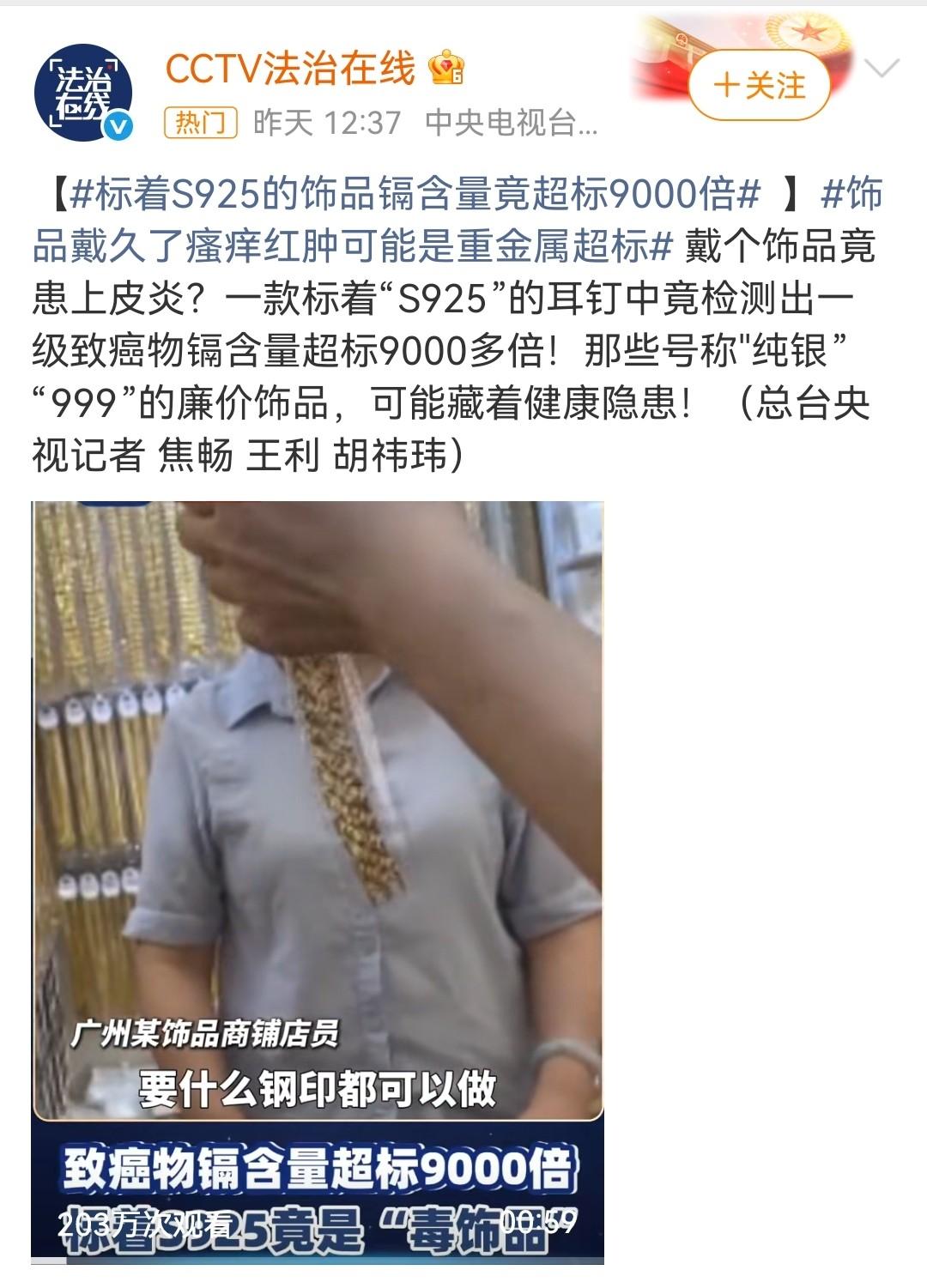 而来自于CCTV法治在线发布的一则视频里,表明市面上很多含有S925的耳钉,那些号称纯银“999”的廉价首饰,藏着健康隐患。