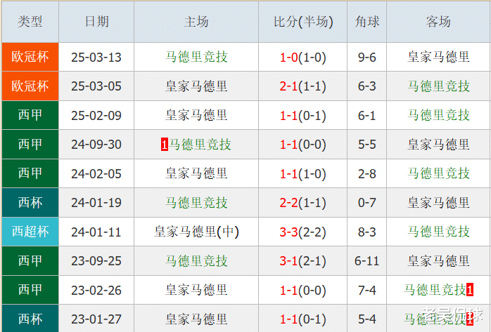 从2023年1月27日到现在的两年8个月时间里,皇马和马竞在西甲、国王杯、西超杯以及欧冠上四个战场上一共交锋10次,双方只有三次分出了胜负。你们猜取胜多的是哪支球队?没错,就是马德里竞技。马竞分别在203年9月25日的西甲和上赛季的欧冠上两次击败皇马,都是在主场。而皇马唯一获胜的场次也是去年欧冠,同样是主场。其余七场比赛,双方全部战平。比分从1比1到2比2,再到3比3,可见无论皇马的阵容如何变,西蒙尼总是能够找到应对的方式。