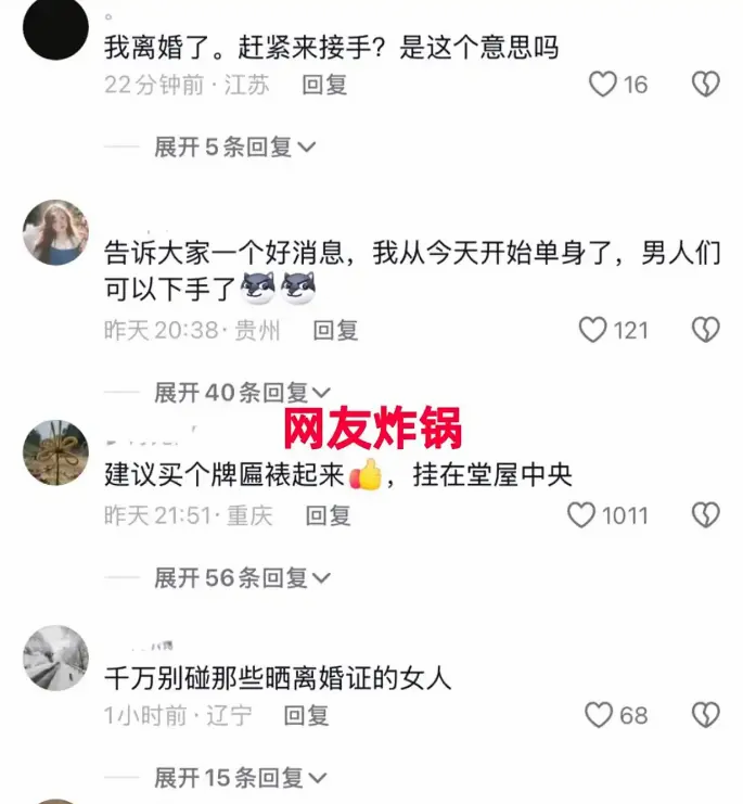 女子配文称,别人结婚我离婚,现在离婚了,终于解脱了,自由了,不用看前夫的脸色过日子也,以后自己想买啥就买啥。