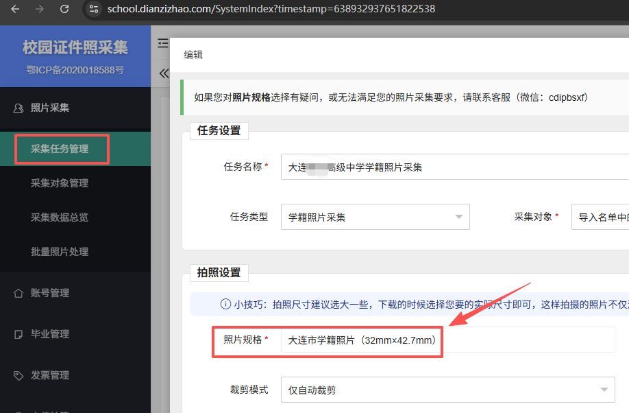 这里注意将“照片规格”选择为:大连市学籍照片(32mm×42.7mm),这样后续拍完照片就会自动处理成学籍平台要求的规范格式,包括浅蓝色背景、文件大小、头顶距离、头部比例等,直接下载就是符合要求的照片文件。
