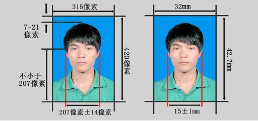 b.照片规格:32mm(宽)× 42.7mm(高) ,像素315(宽)× 420(高),分辨率250dpi;