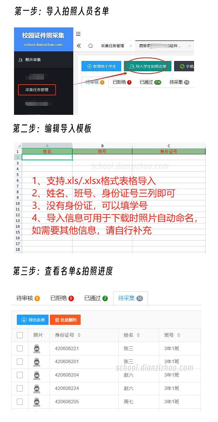 3)支持手机、数码相机、USB外置摄像头等方式进行采集,按学生名单拍照即可。支持教师按班级拍照、下发拍照二维码给家长自行拍照等方式。