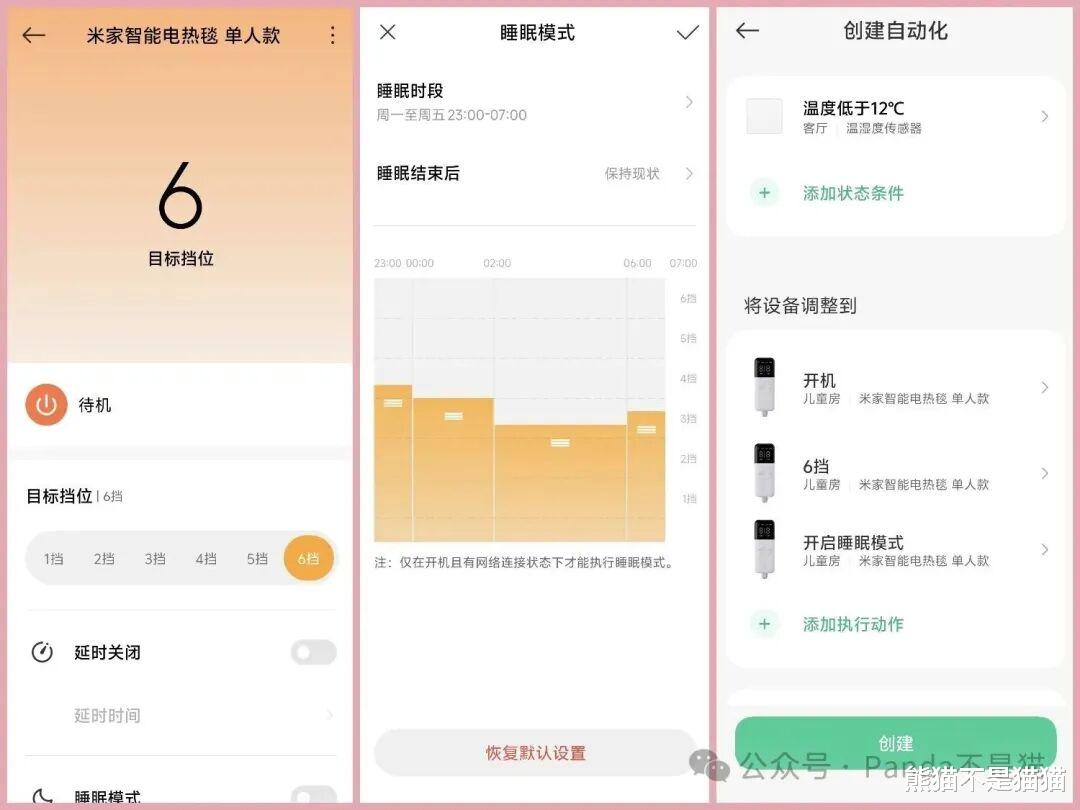 在米家APP界面支持对档位、定时进行远程设置,同时在这里也能设置睡眠时段,可以根据你所在地的温度情况来设置每个时段的档位,如果家里米家设备比较多,还可以通过自动化来设置智能场景,例如到一定时间时通过温湿度计的温度来决定是否开启电热毯。