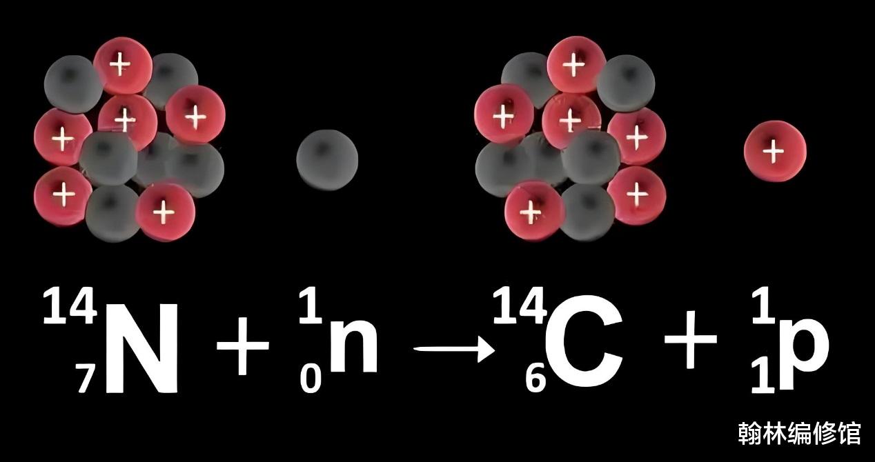 这些中子再去撞击大气中丰富的氮-14原子,一次撞击就能让一个氮原子变成一个碳-14原子和一个氢原子。