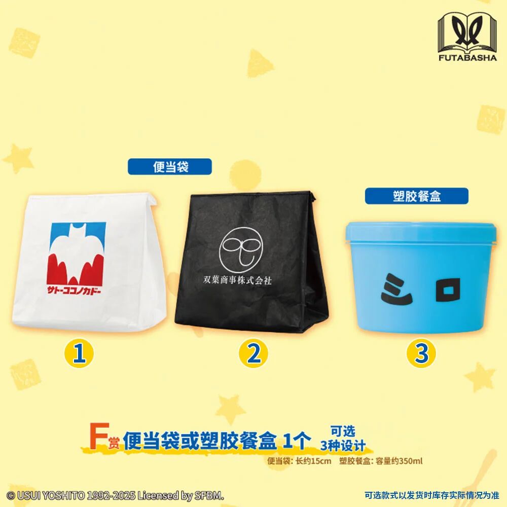 F 赏可以选择便当袋或塑胶餐盒,一共 3 种设计任你挑!便当袋有印着卡通图案的白色款,清新又可爱;还有印着 “双叶商事株式会社” 的黑色款,瞬间 cos “社畜小新”,打工人 DNA 直接动了;蓝色的塑胶餐盒容量约 350ml,装份沙拉、装些小零食都正好。