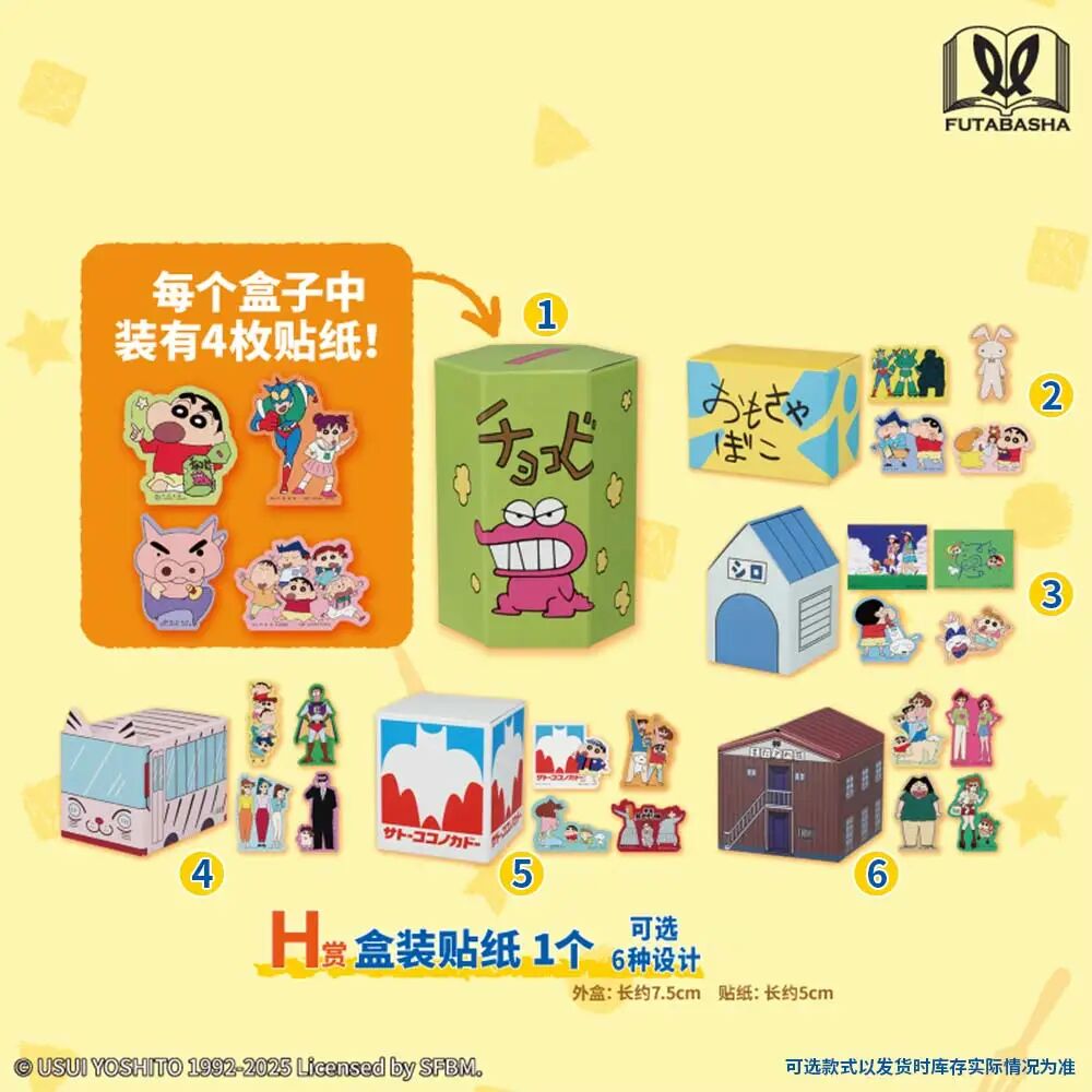 H 赏是6 种设计的盒装贴纸,每个盒子里都藏着 4 枚贴纸,图案涵盖小新一家、动感超人、小白等经典元素。