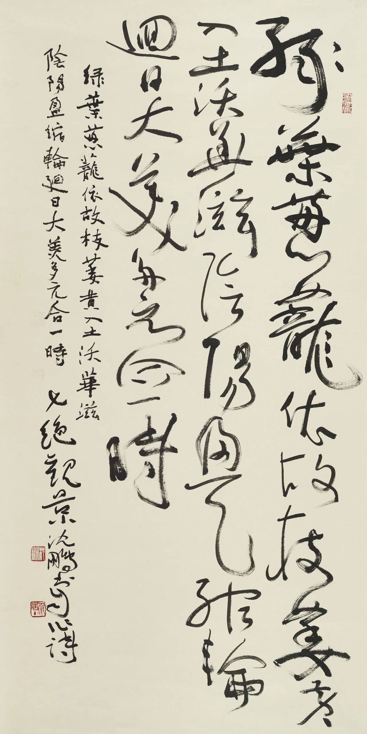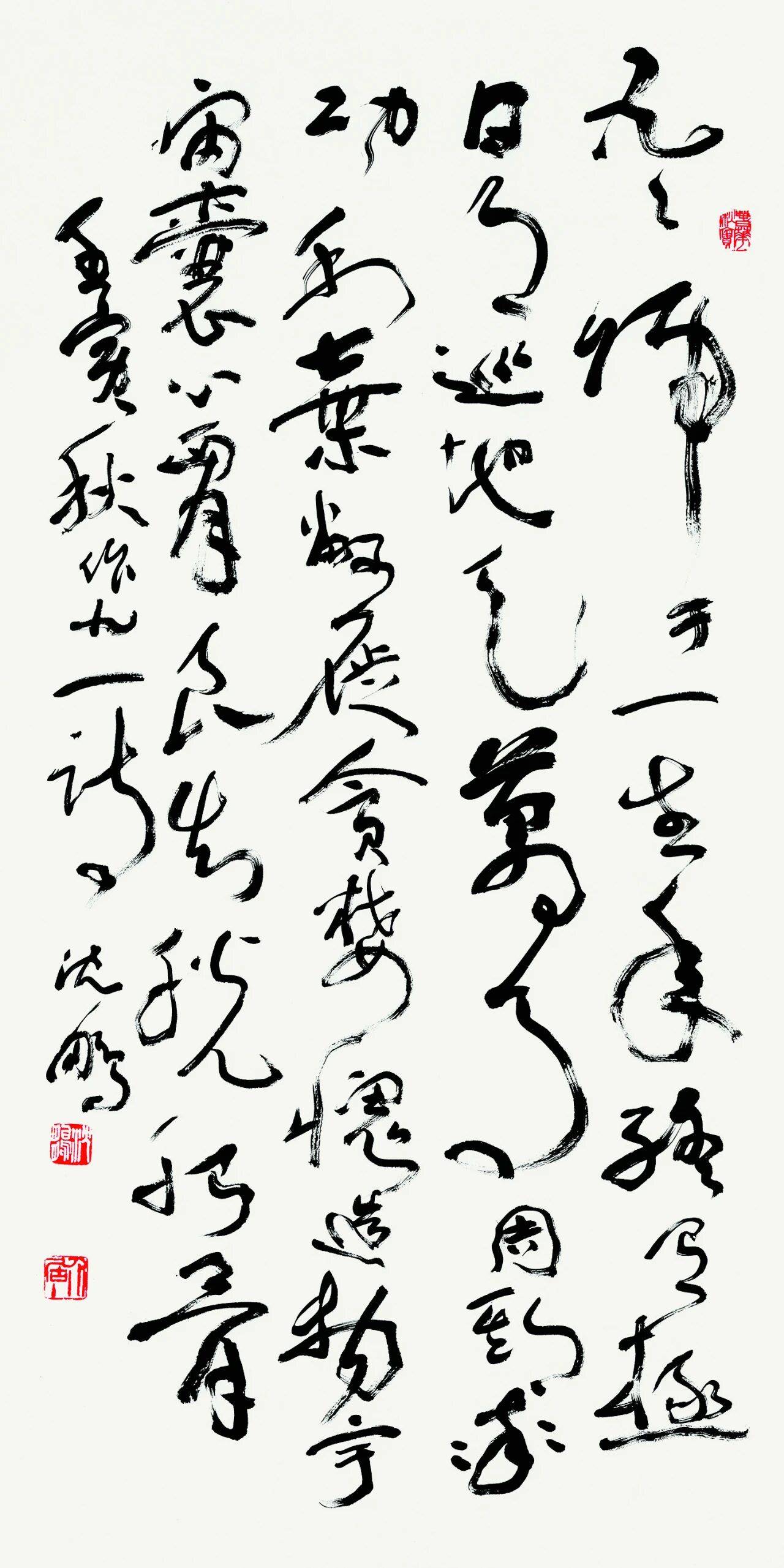 但是沈鹏先生有自己的取法定位和优势,他喜欢草书,也擅长草书,在熟练草法基础上,凭借其早年在美术评论方面所积累的审美高度,广揽博取,从不同碑帖中吸收营养,最终写出了丰富多姿极具个性的草书。他的书法,赢在线条的质感和章法,现场看真迹的话这种感受会更深一些。