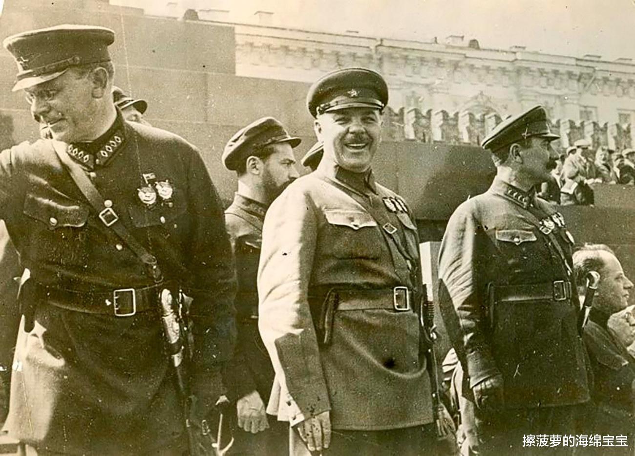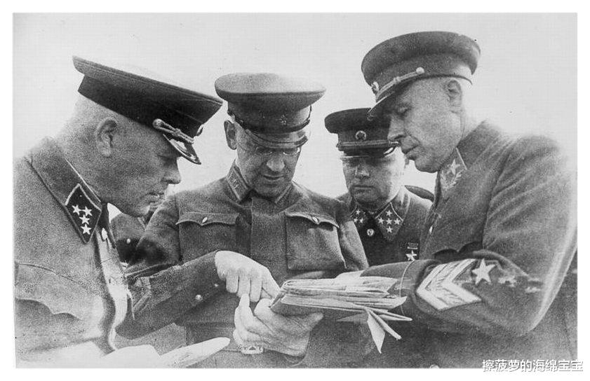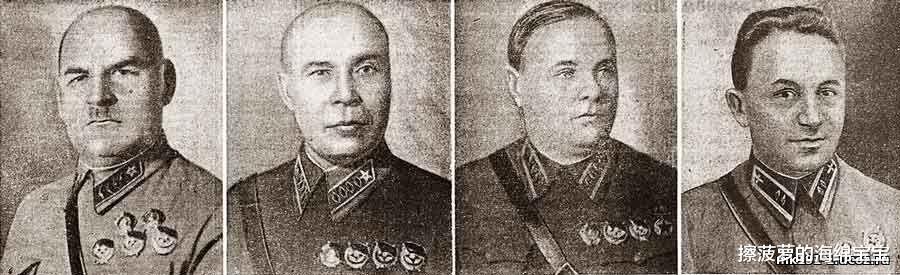 从左到右:一级集团军司令格里戈里·伊万诺维奇·库利克,一级集团军司令谢苗·康斯坦丁诺维奇·铁木辛哥,二级集团军司令基里尔·阿法纳西耶维奇·梅列茨科夫和是航空兵师长谢尔盖·普罗科菲耶维奇·杰尼索夫