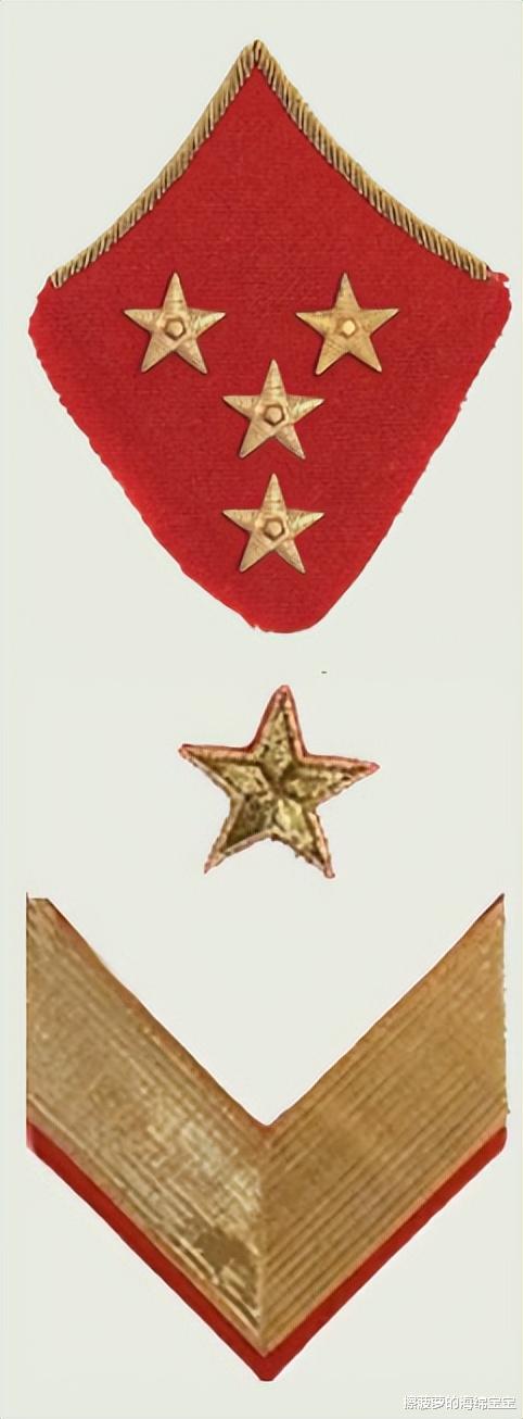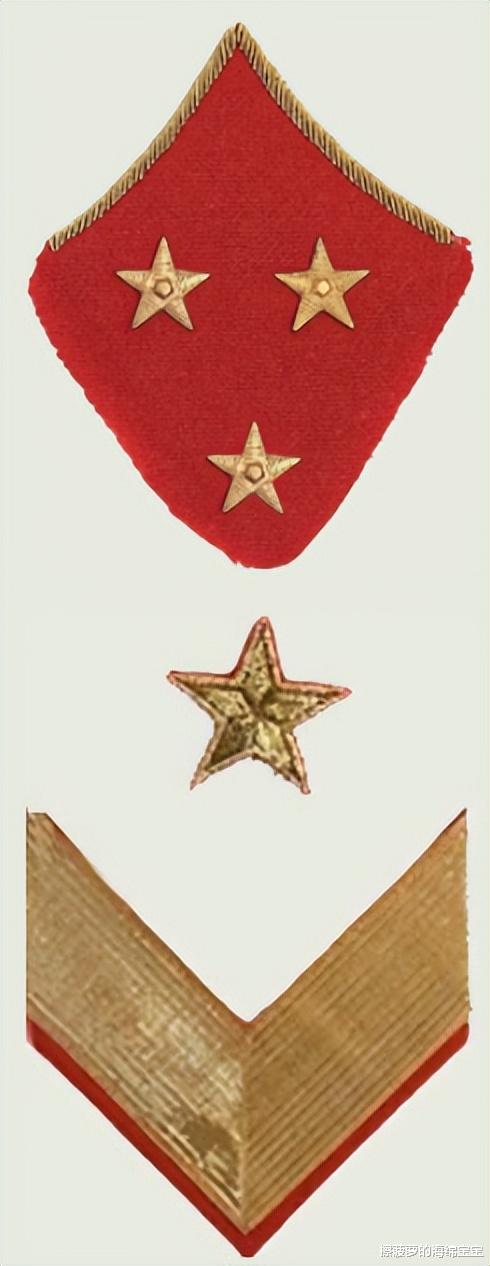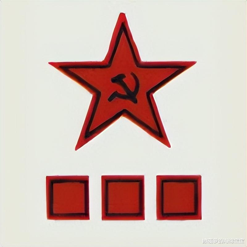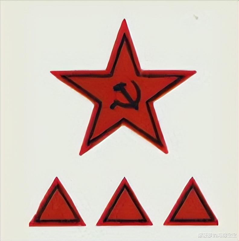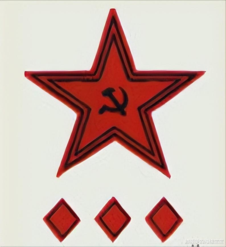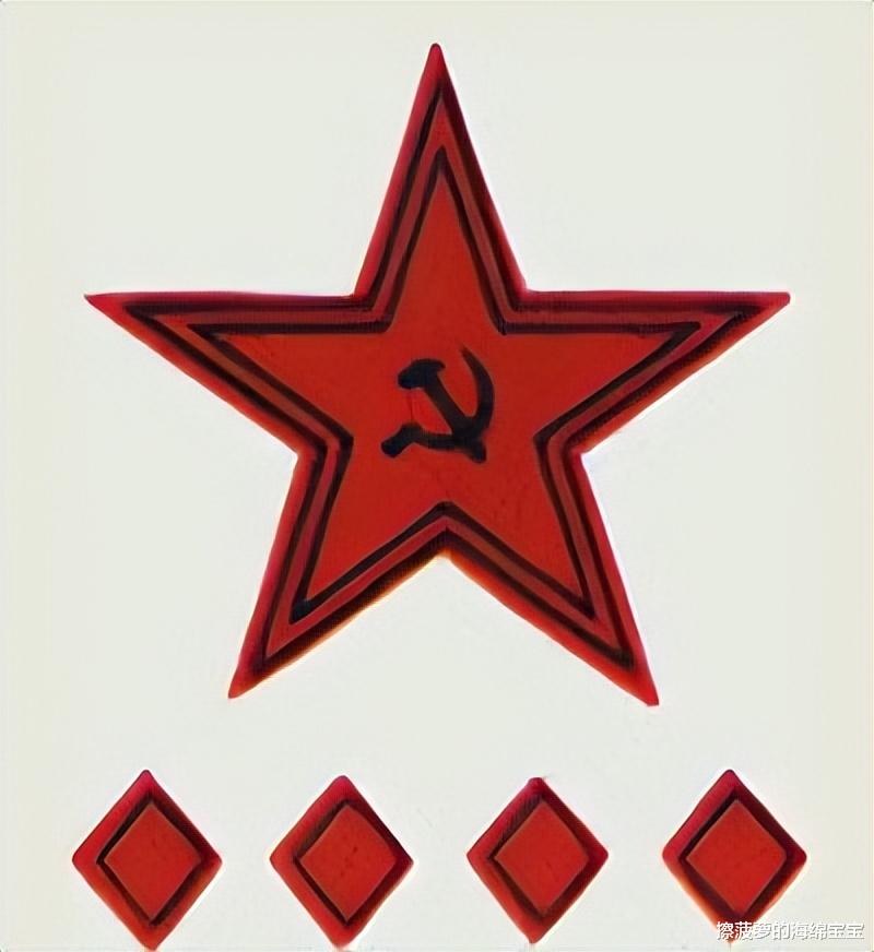 1918-1922根据1918年4月25日人民委员会的命令,成立了一个特设委员会,负责起草关于工农红军制服的建议。1918年11月29日全俄中央执行委员会批准了这些建议,并同意工农红军地面部队使用职务名称,职务标志为袖章类型,佩戴在左袖上,上面一个红色五角星,旅长及以上等级的红色五角星为两层黑边,旅长以下等级为单层黑边。红五星里面是镰刀锤子标志,下面用三角,方块和菱形数量代表等级。