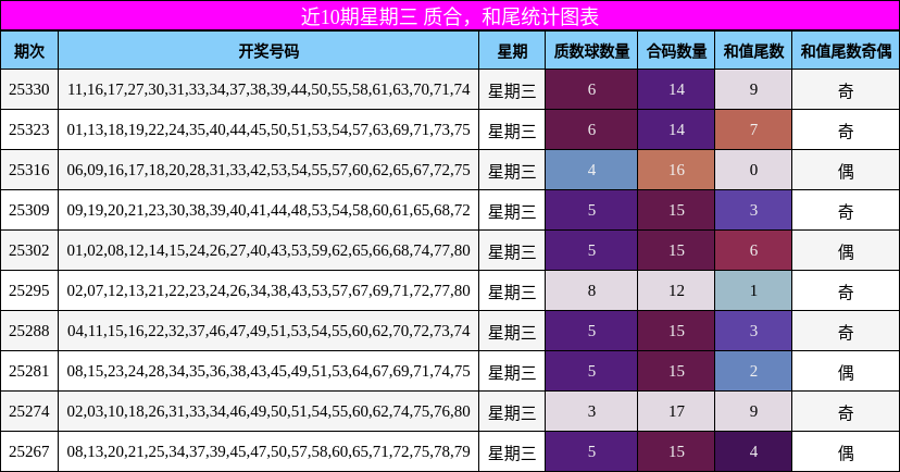 下图展示了近10期星期三的质合与和尾走势情况,可清晰看出合数长期压制质数的态势,且和尾波动范围稳定在0-9之间,未出现明显偏移。